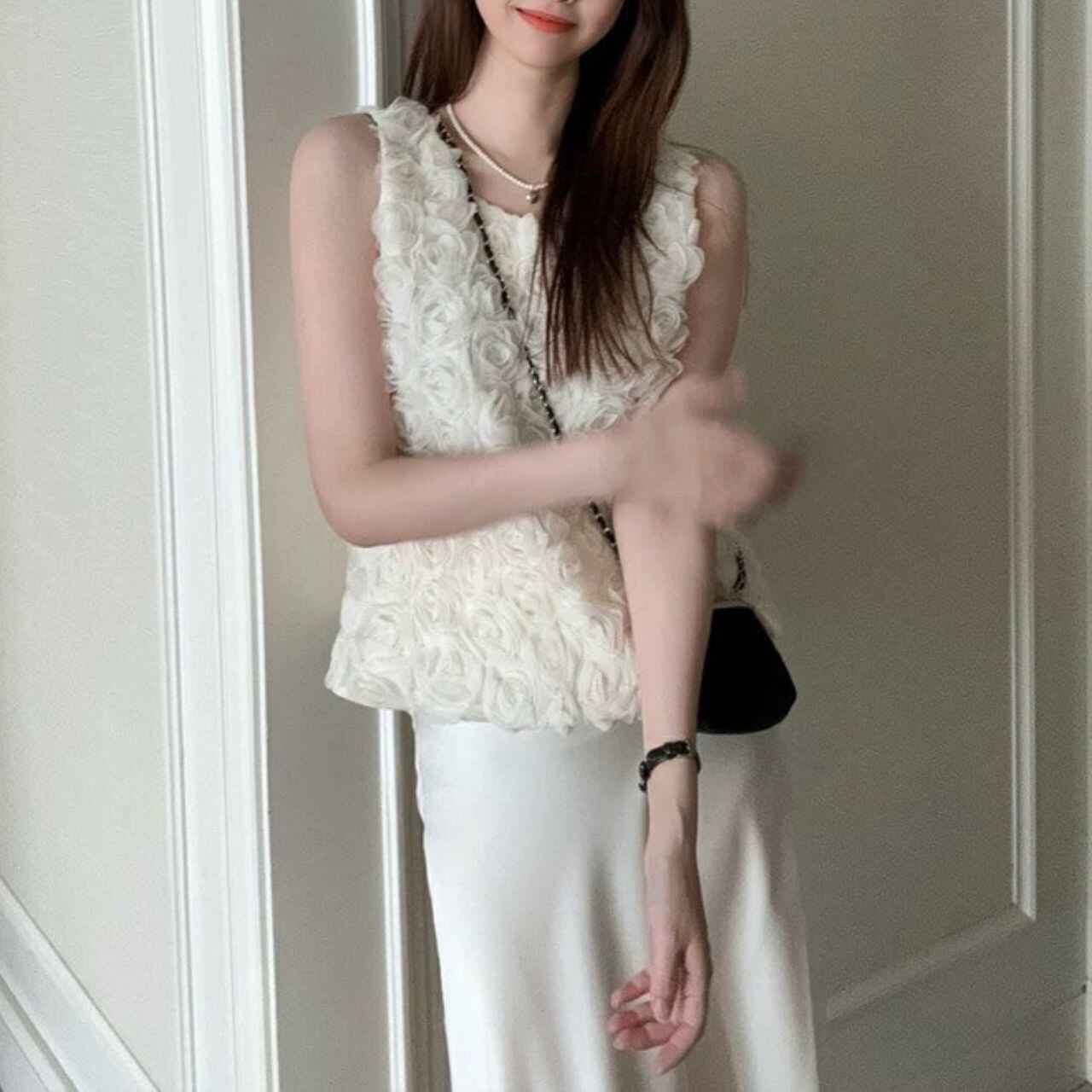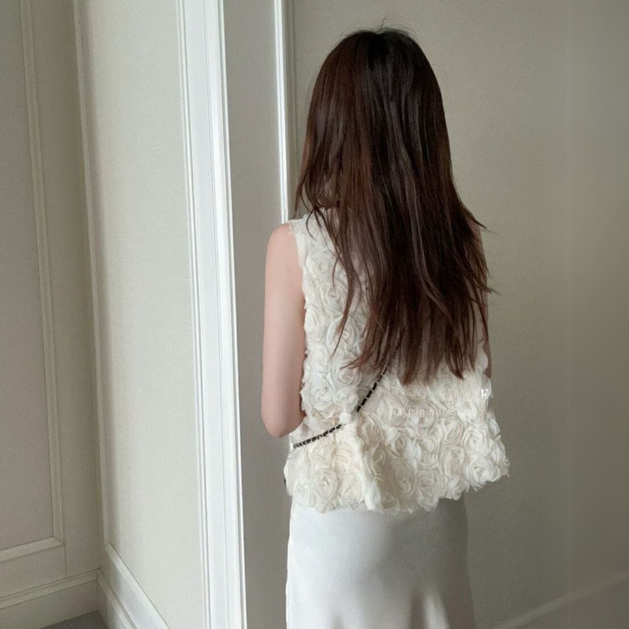 ♡全面 チュール バラの花 ラウンドネック ノースリ プルオーバー ショート丈