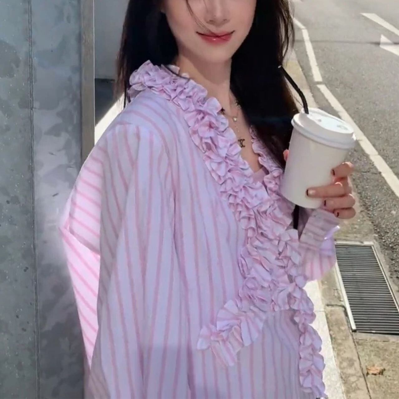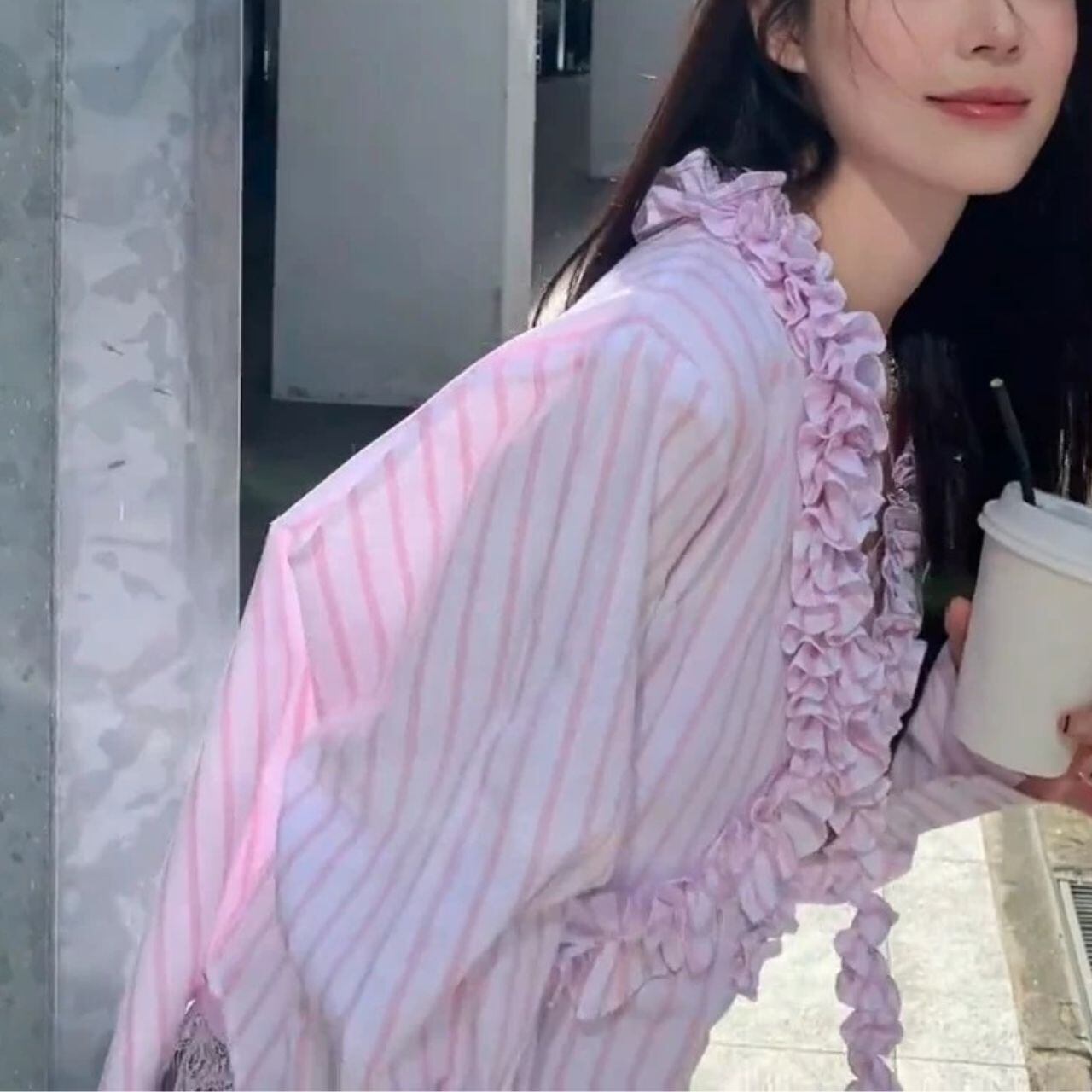 ♡ピンクストライプ Vネック 立体フリル 長袖 ロングカフス シャツブラウス