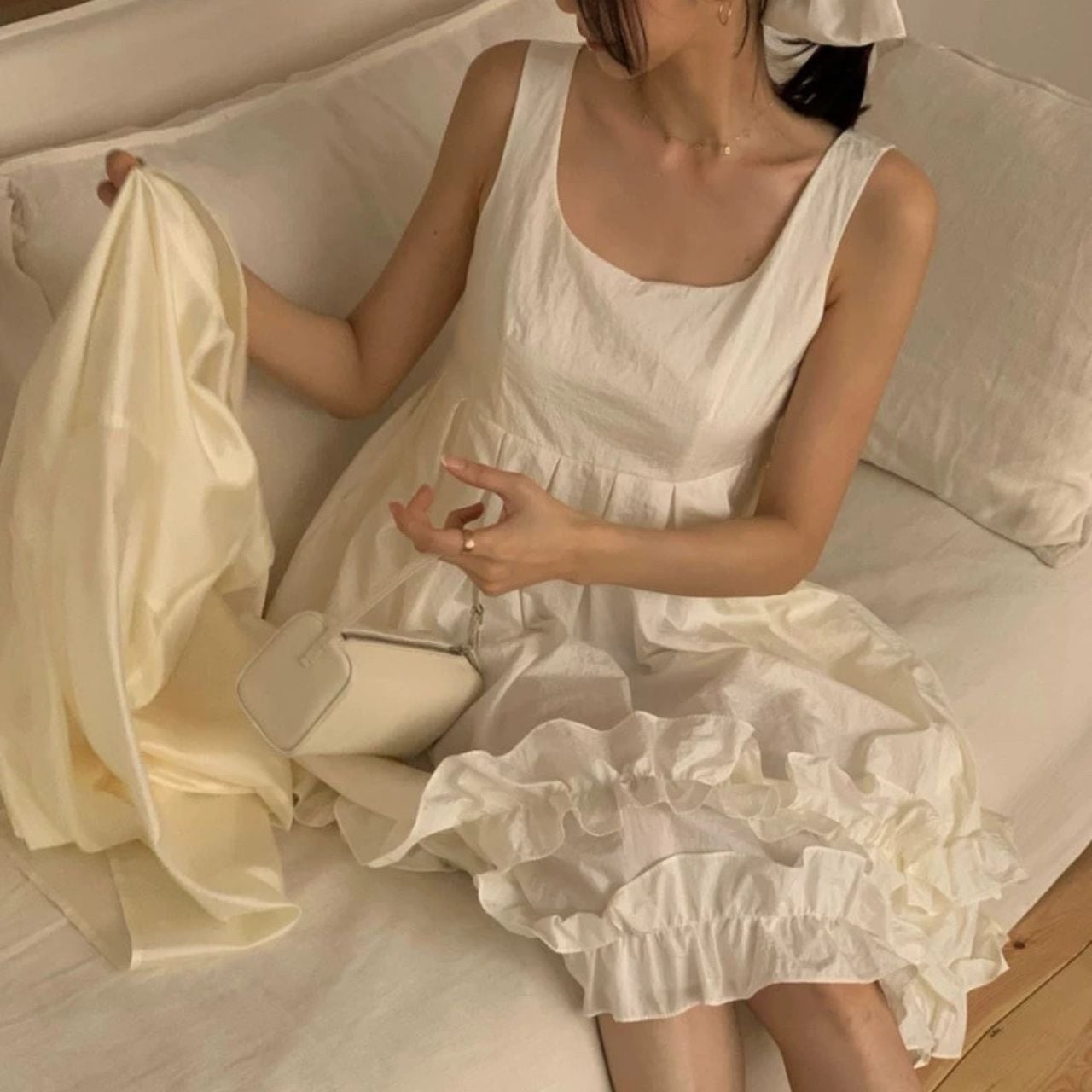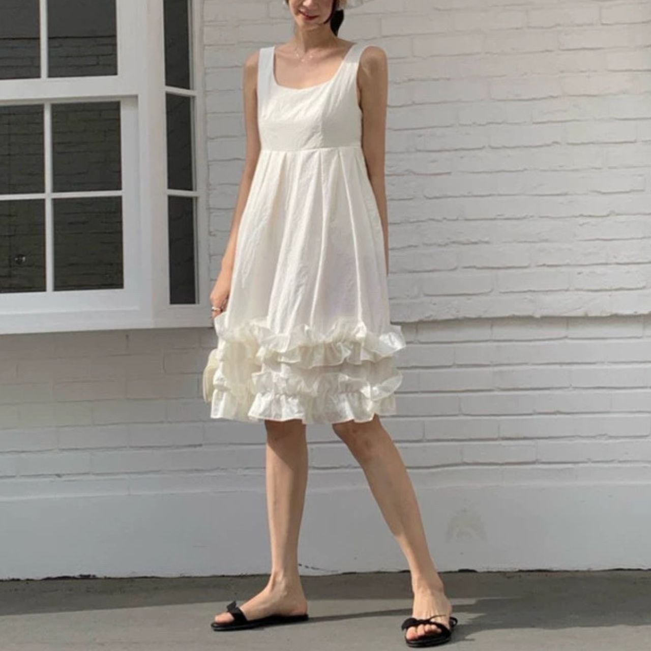 ♡Uネック ハイウエ 切替タック 裾Wフリル 膝丈ドレス