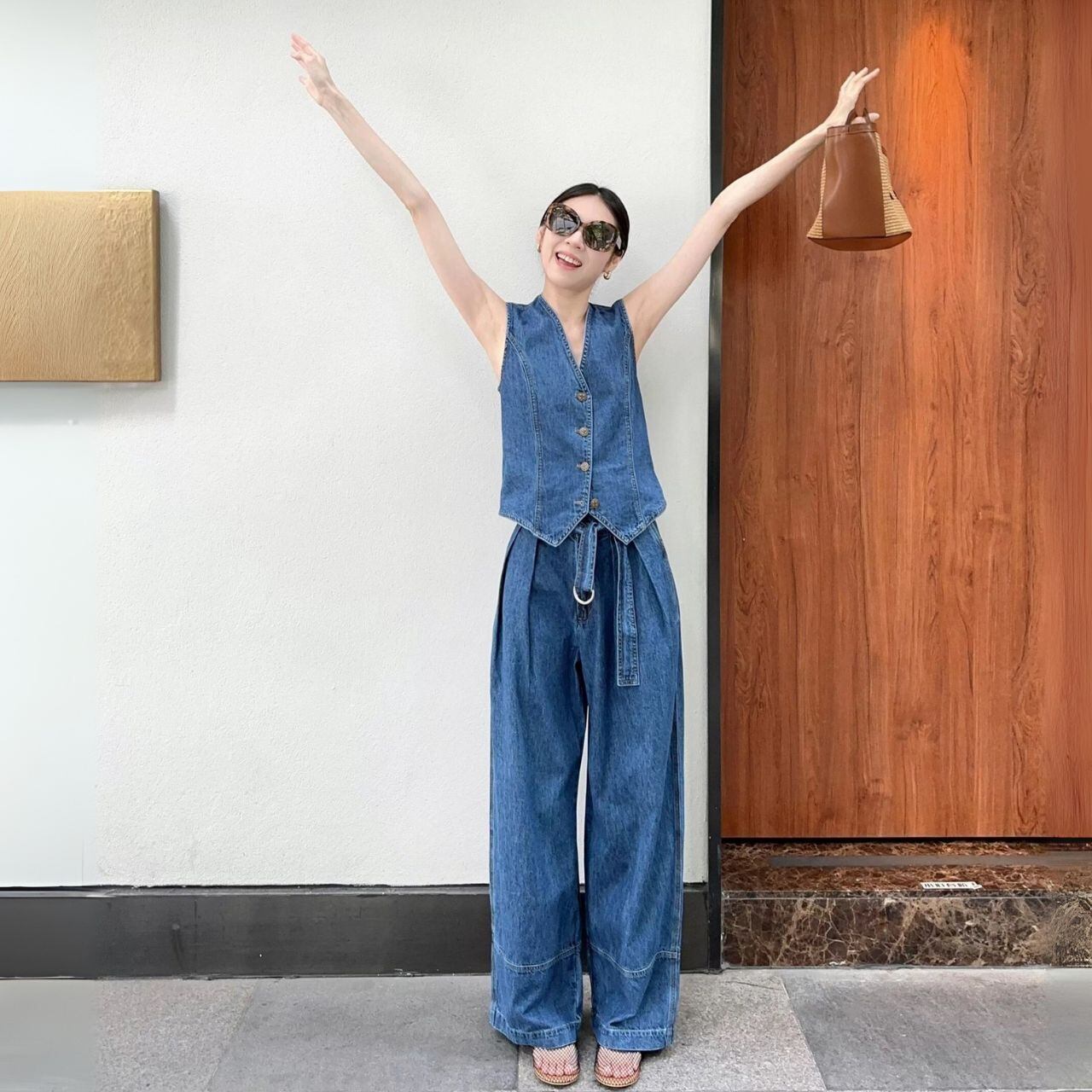 ♡デニム Vネック シングルブレスト ショートベスト+ワイドデニム セット