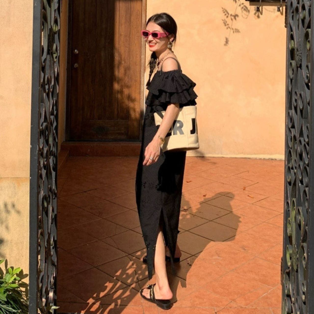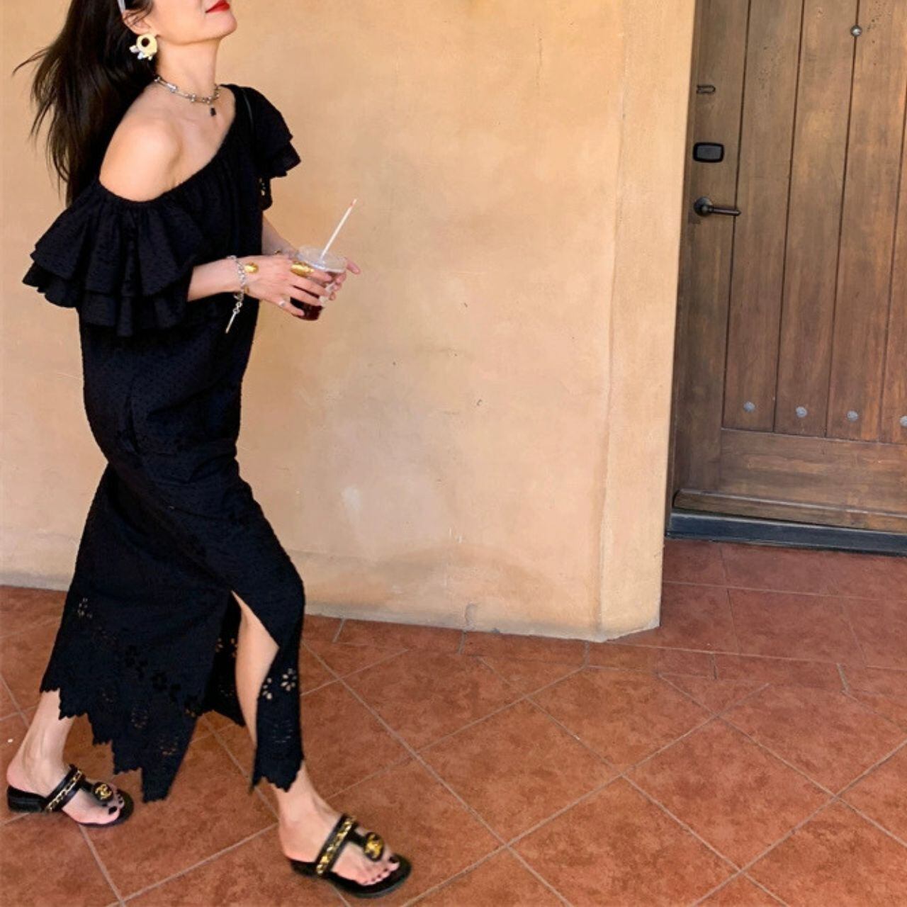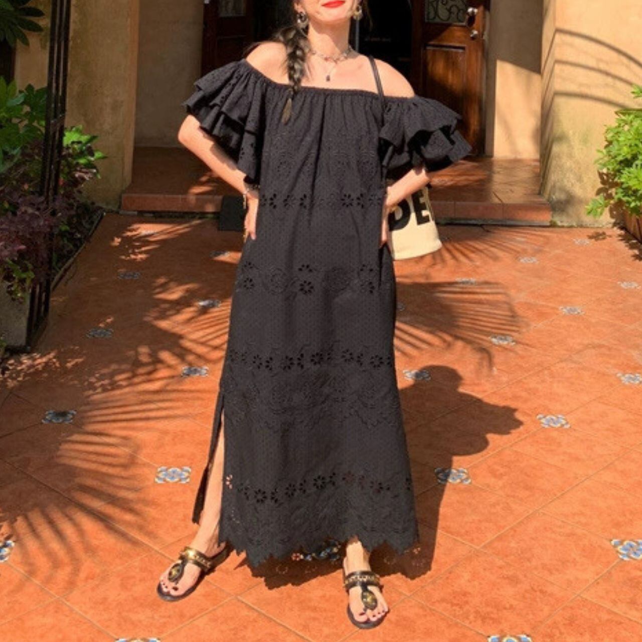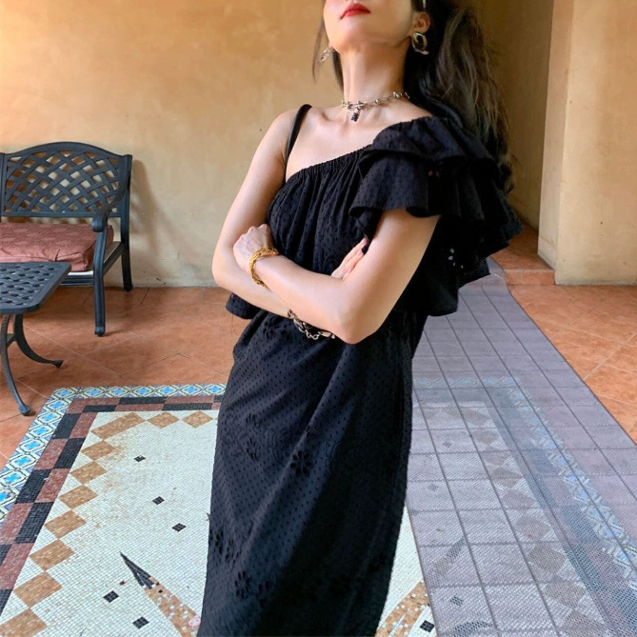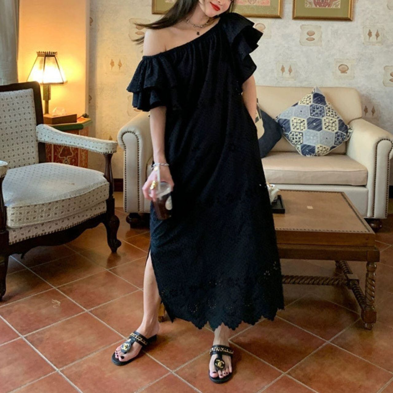 Wフリルスリーブ ワンショルダー サイドスリット 程よいゆとり ロング丈