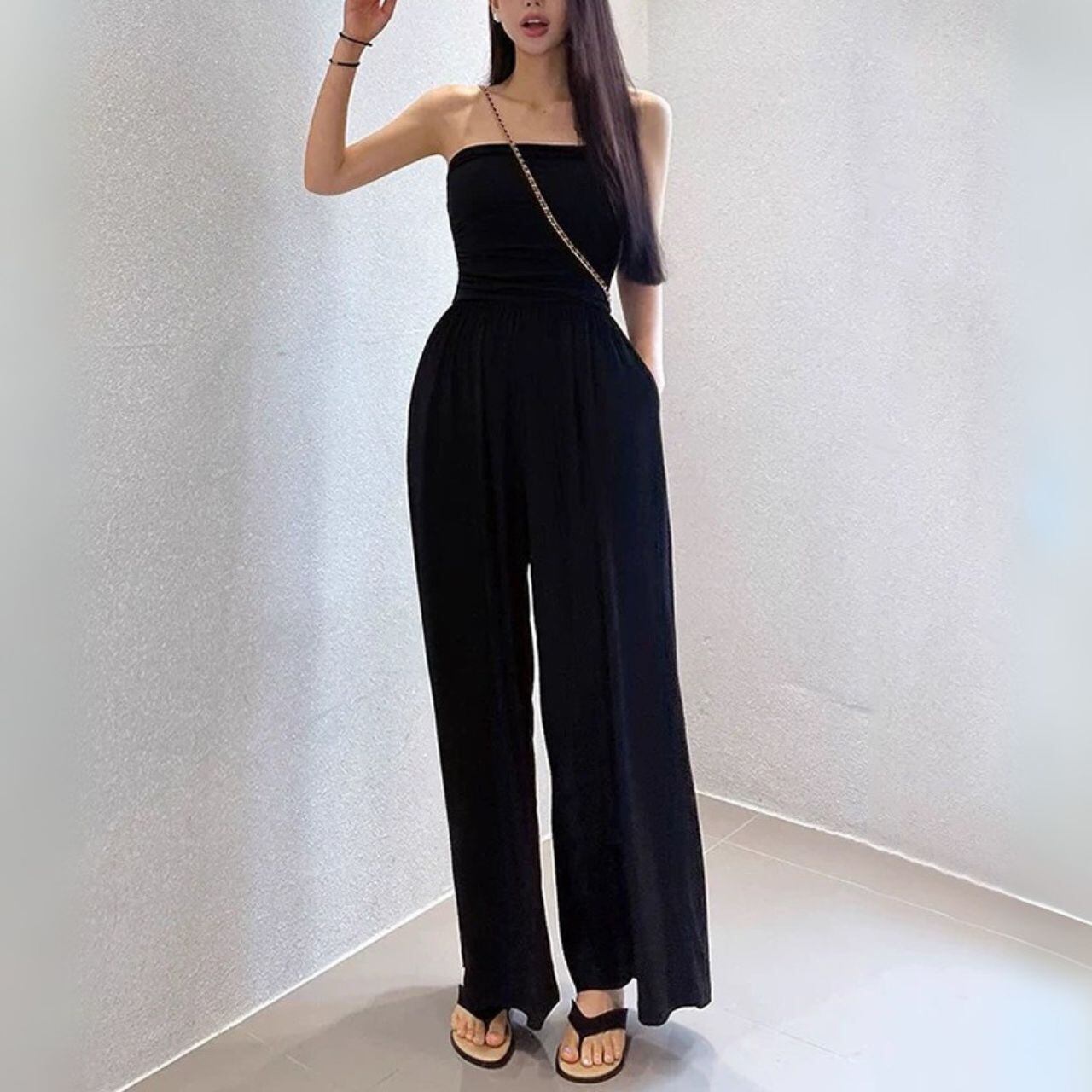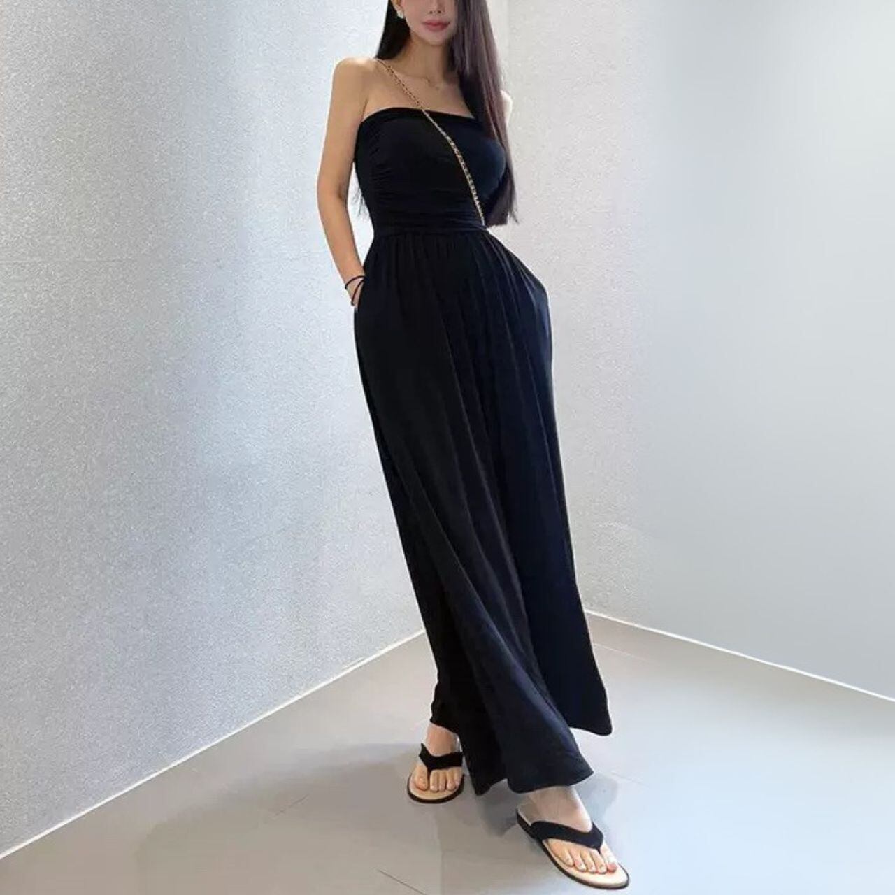 ♡伸縮性ある素材 チューブトップ ハイウエ切替 ワイドパンツ サイドポケット ジャンプスーツ