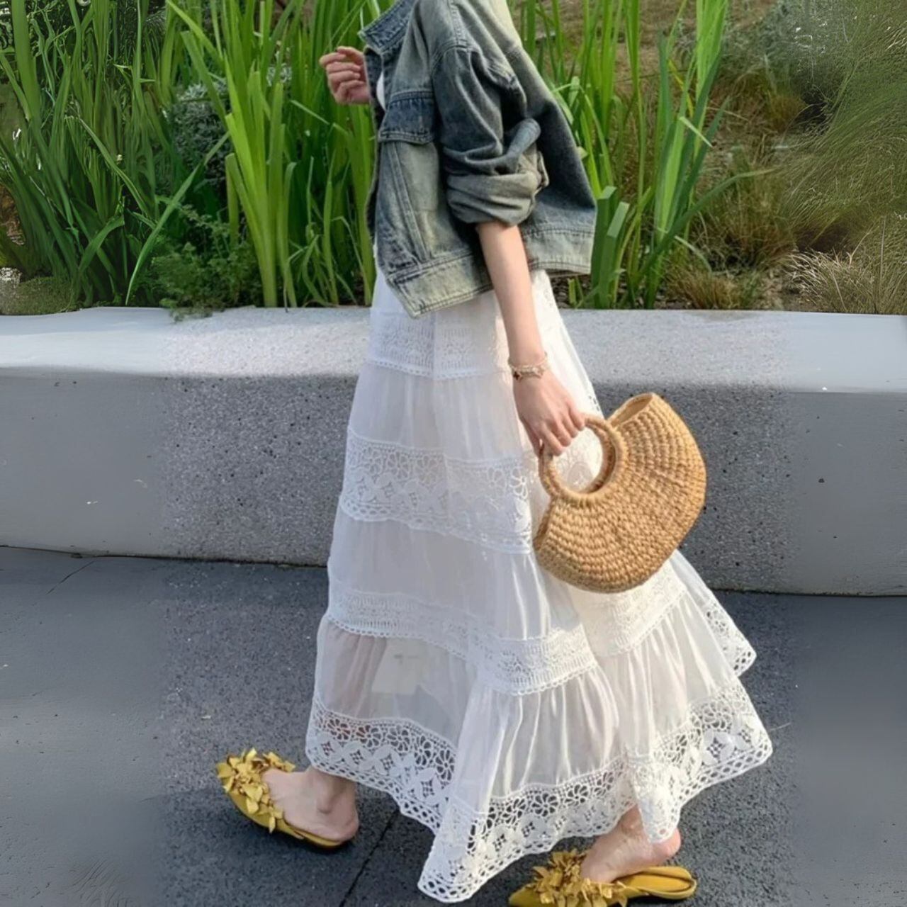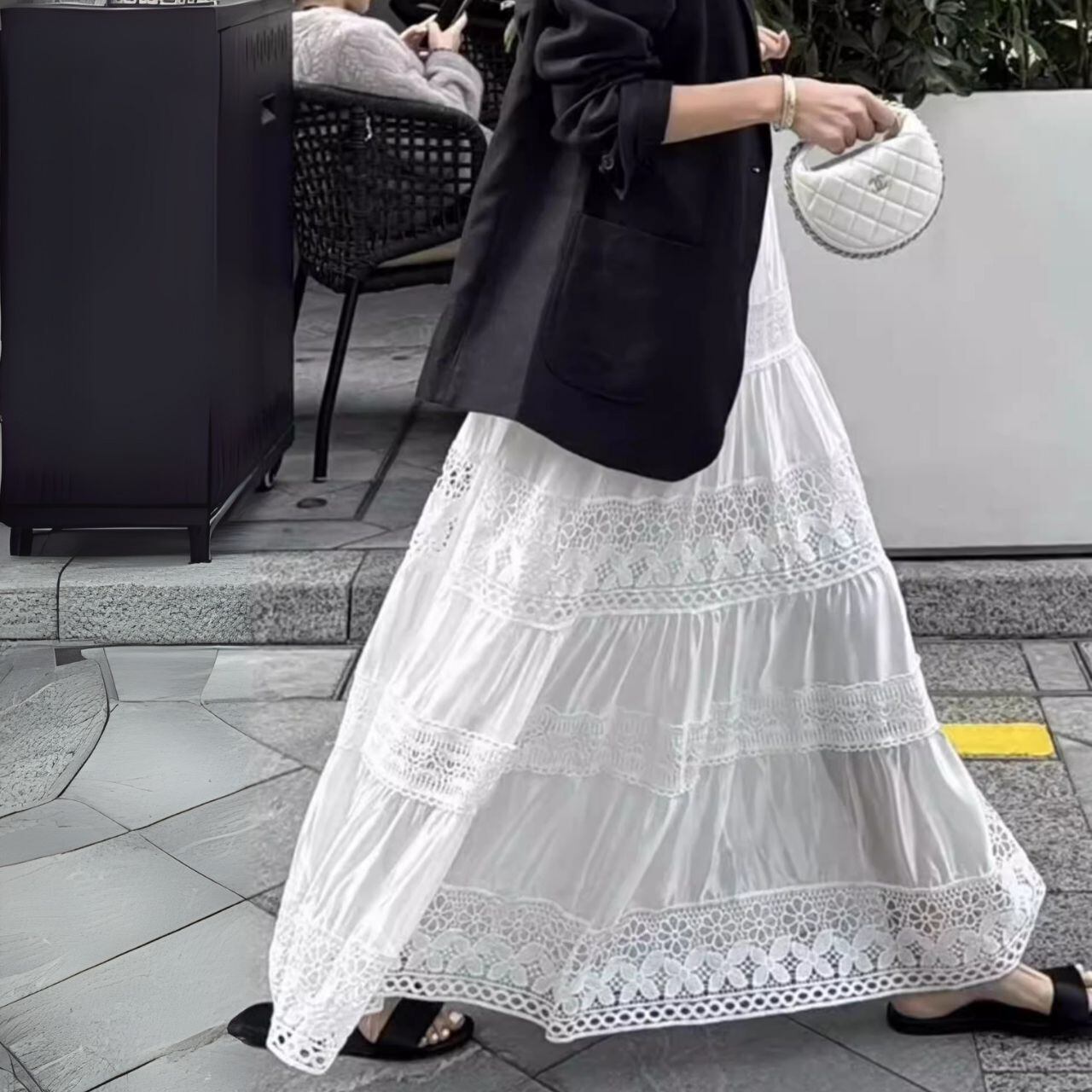 ♡クロシェレース 切替 ウエストゴム ウエストすっきり ティアードスカート ロング丈