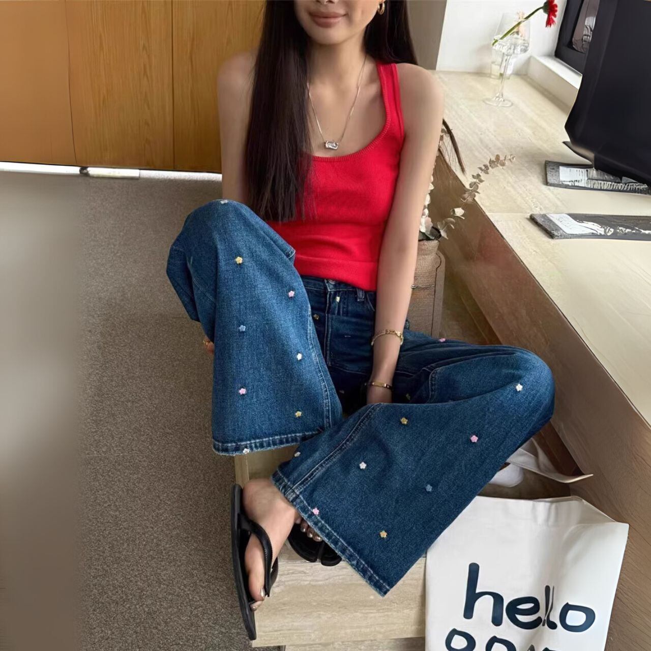 大人 きれいめカジュアル フラワー刺繍 ワイドdenimです♡