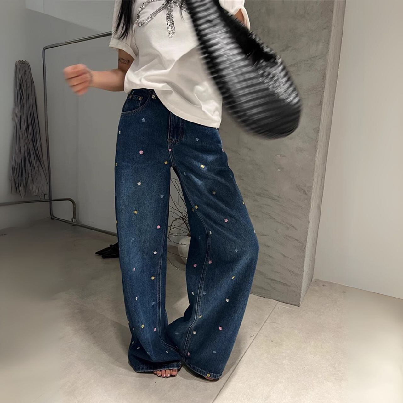 ♡カラフル フラワー刺繍 ハイウエスト ワイドストレート ダークブルー デニム