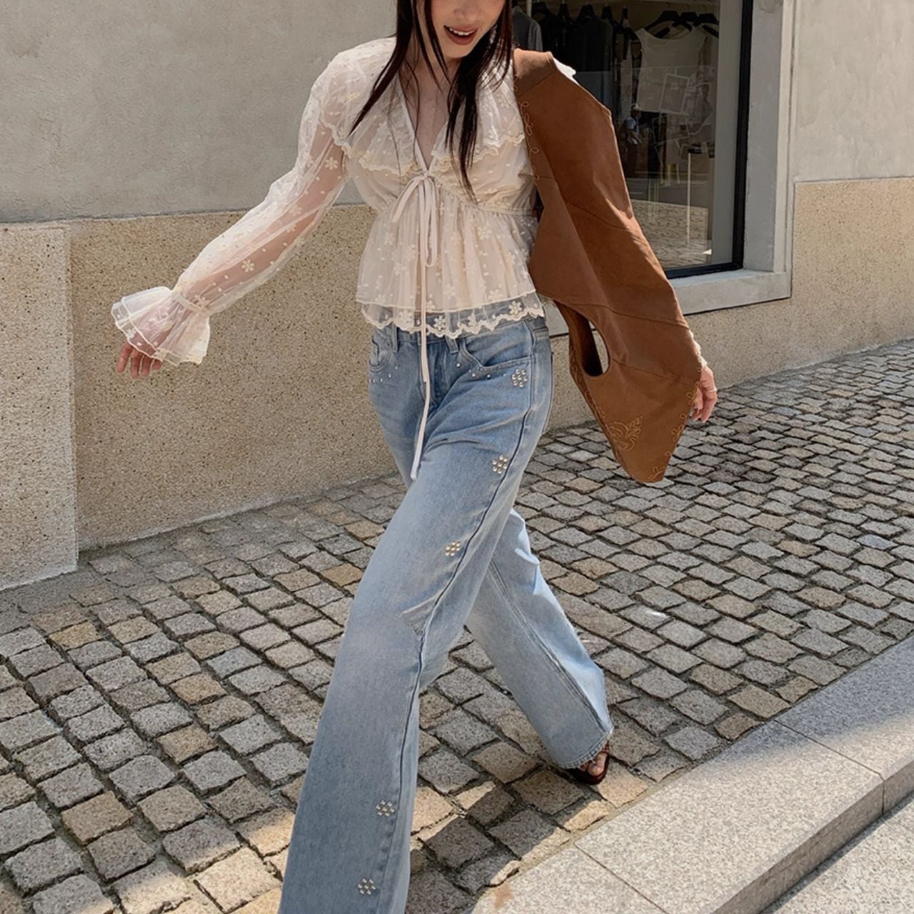 大人 秋レイヤースタイル チュールレース リボン結び blouseです♡