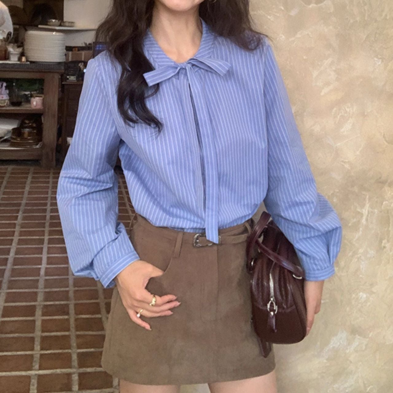 ♡ブルーストライプ ラウンドネック リボン結び 長袖 シャツブラウス