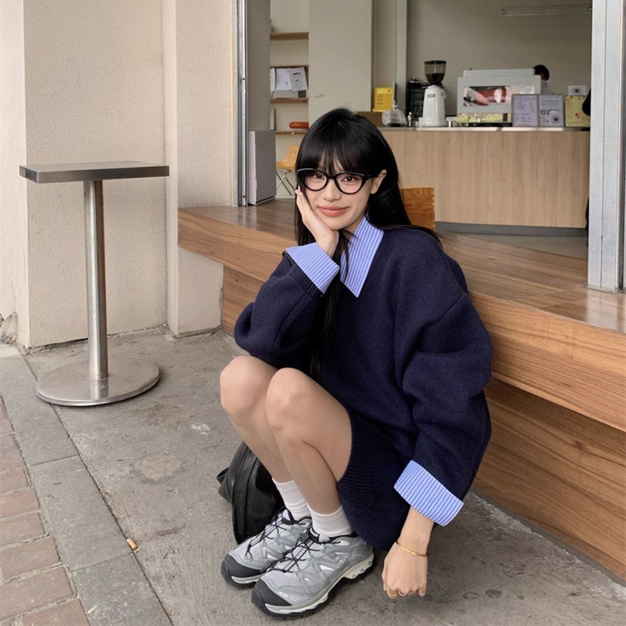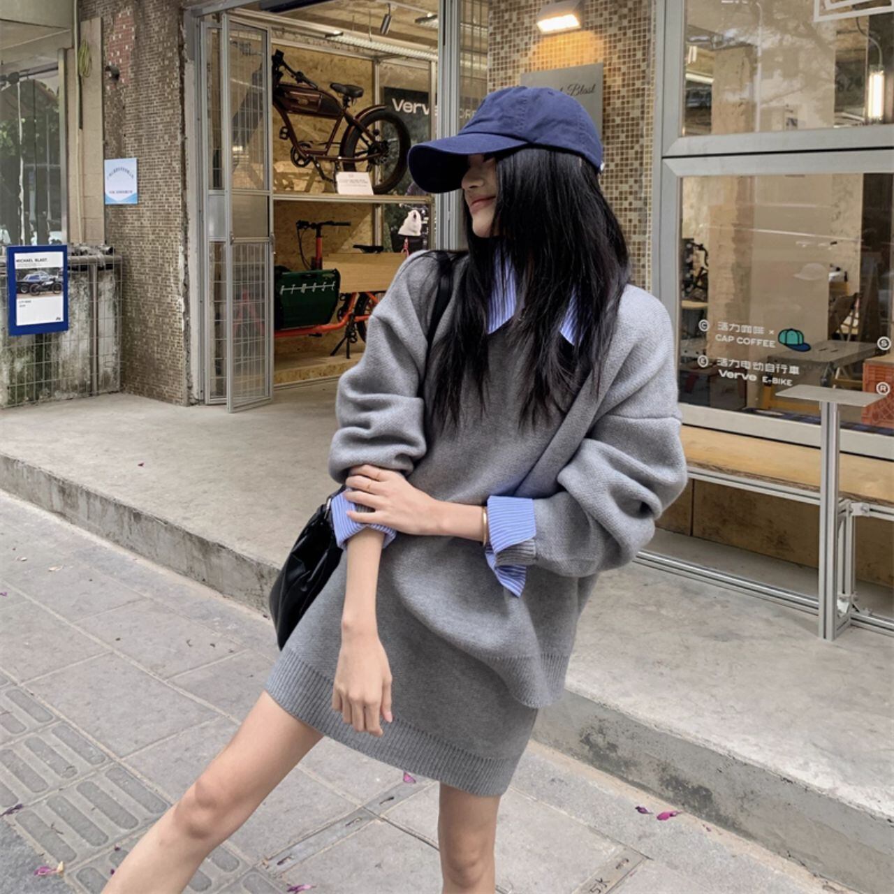 ♡上品 衿&カフス ストライプ ゆったりセーター+ニットミニスカート