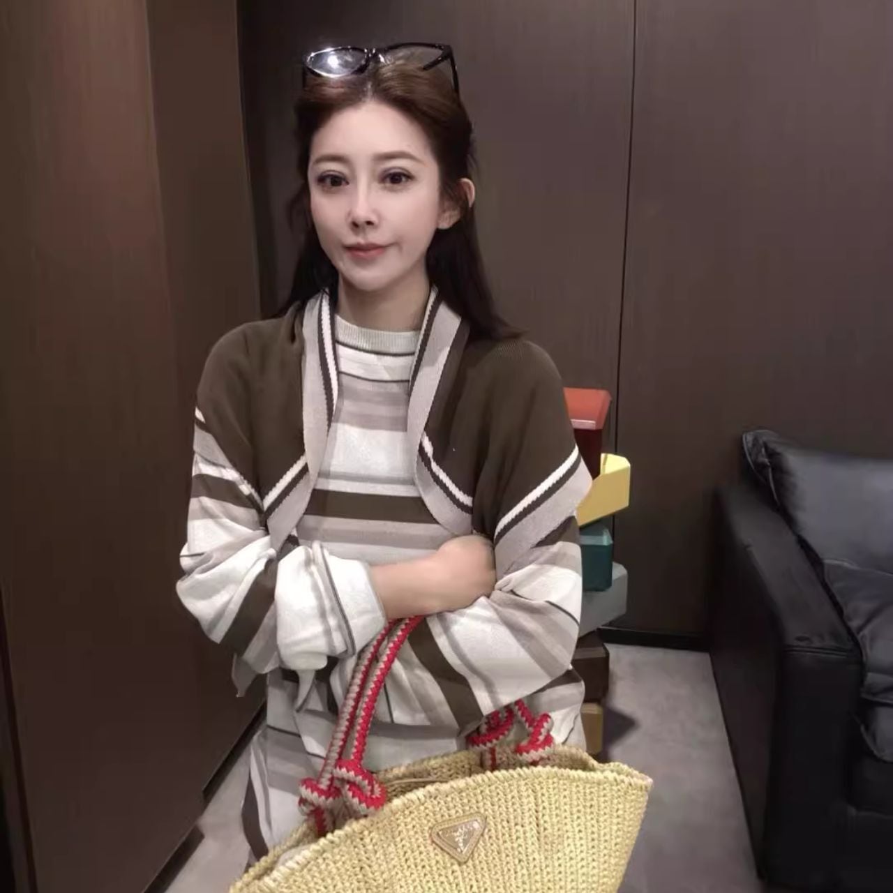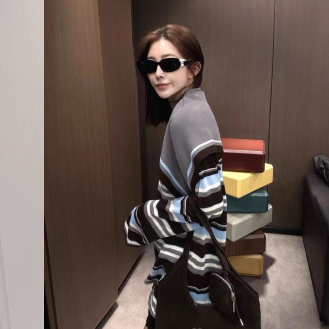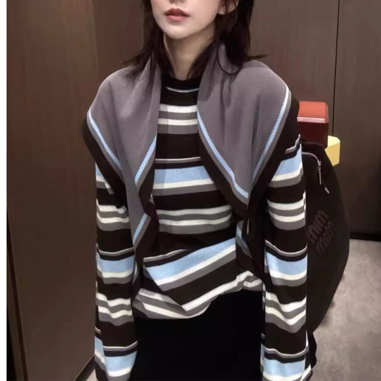 ♡ハイゲージニット素材 ラウンドネック ボーダーセーター & ニットショール セット