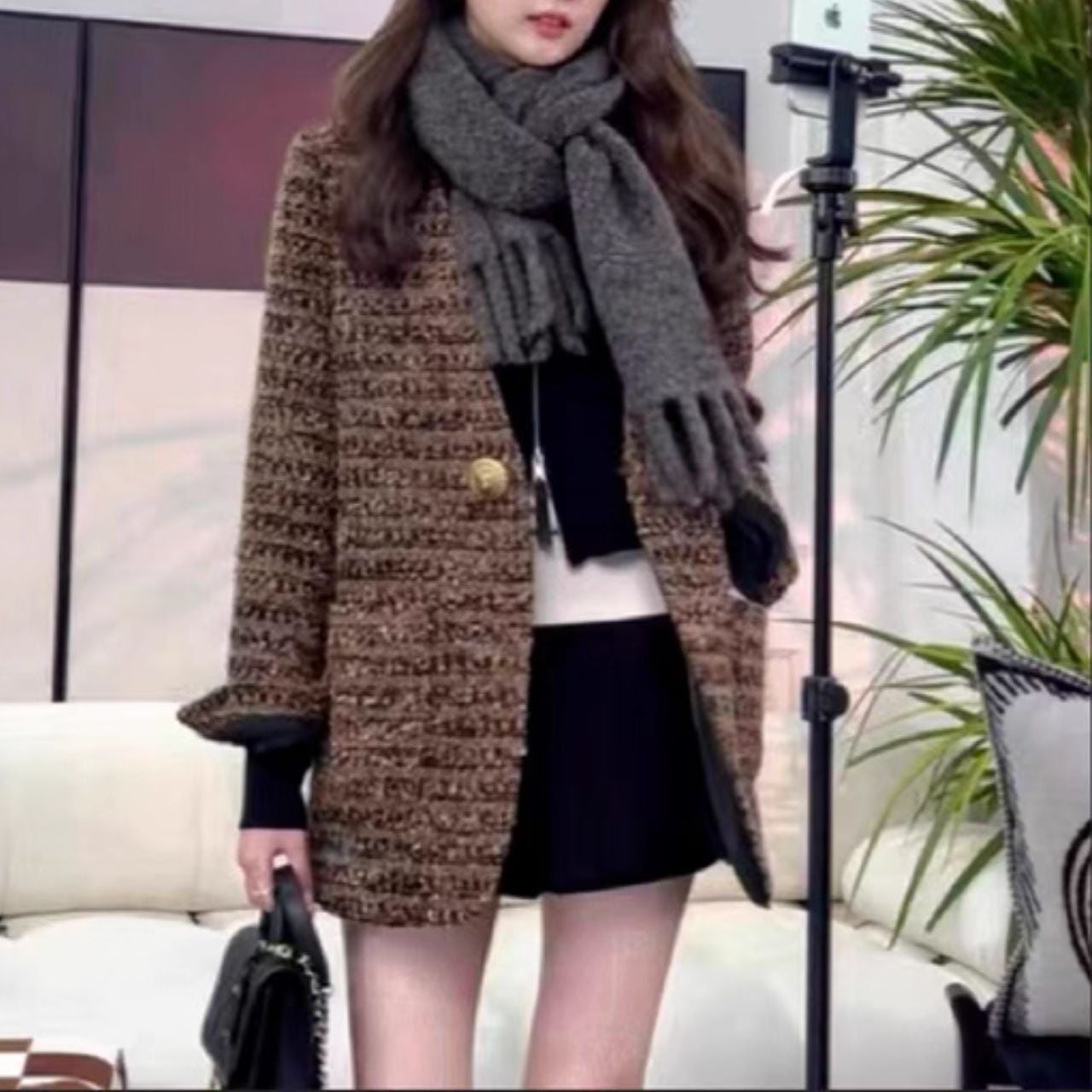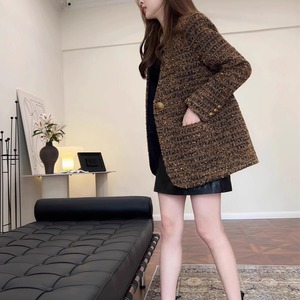 ♡ウール混 ツイード Vネック ゴールドボタン ポケット ミドル丈 ジャケット
