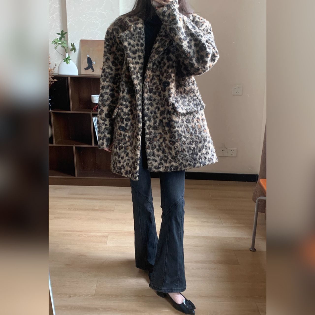 ♡ヒョウ柄ボア 裏スエード フェイクムートン Wブレスト テーラー コートジャケット