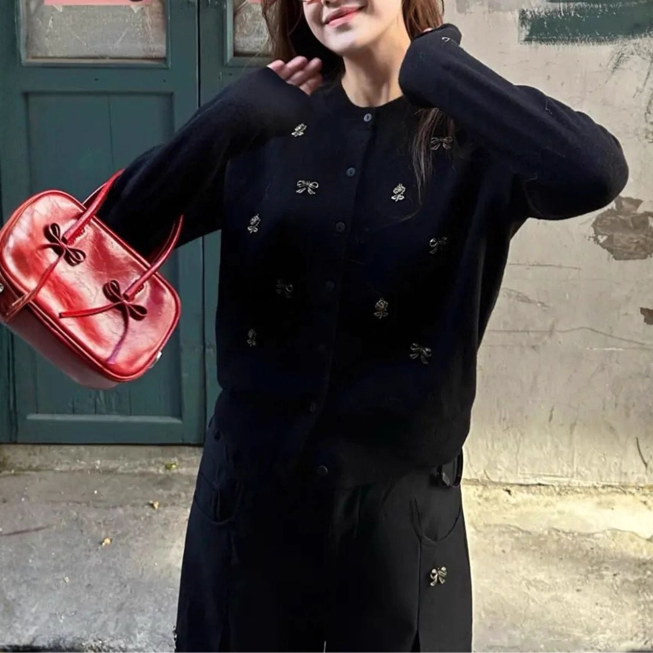 ♡リボン刺繍 ラウンドネック フロントボタン カーディガン+