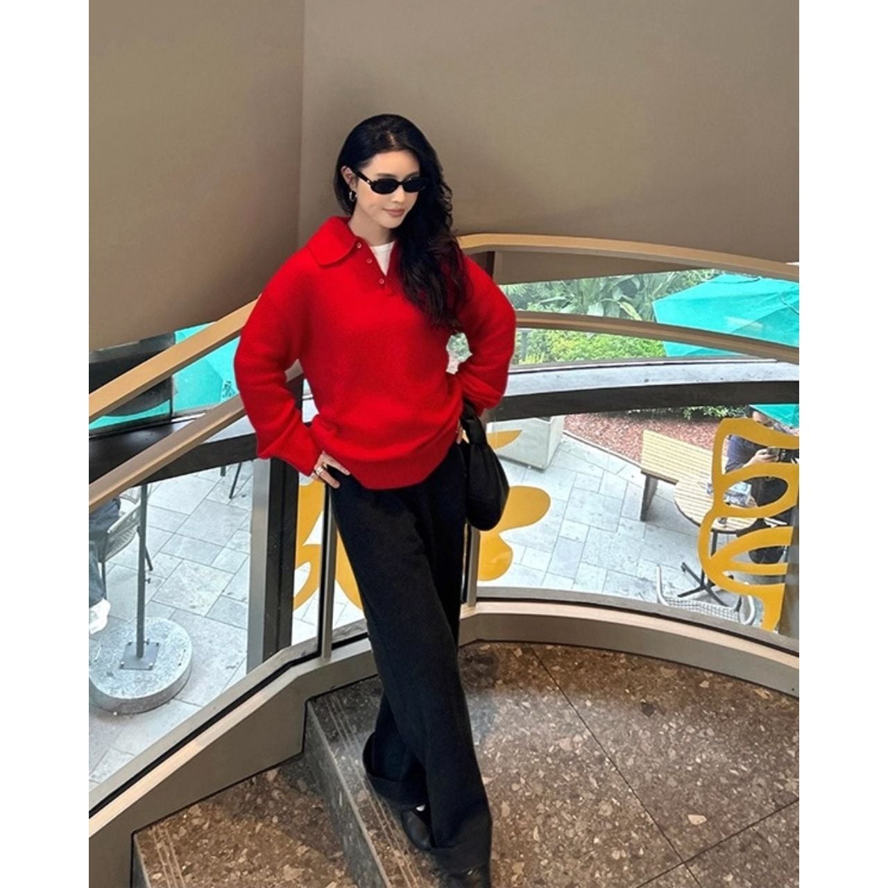 ♡赤色 ハイゲージニット ポロ衿 3つボタン プルオーバー ゆったりシルエット