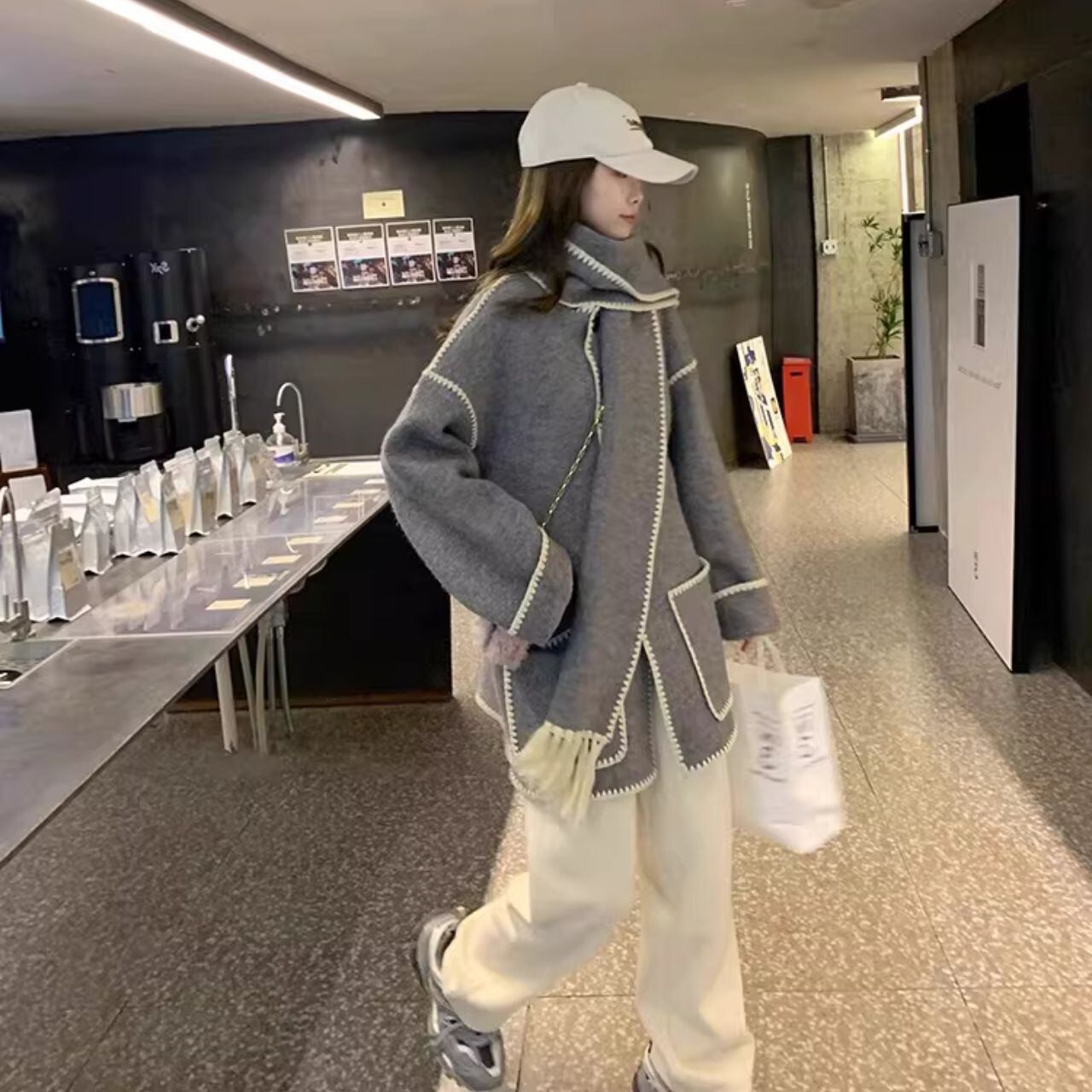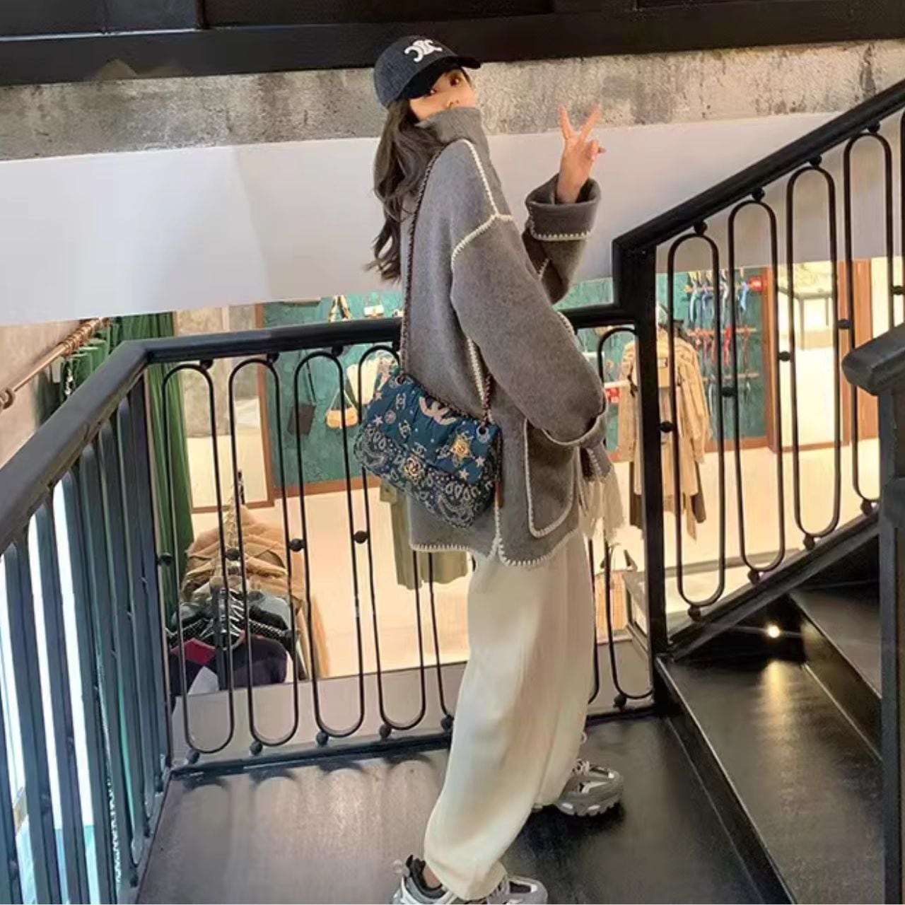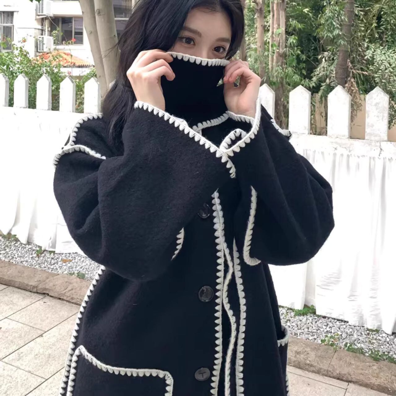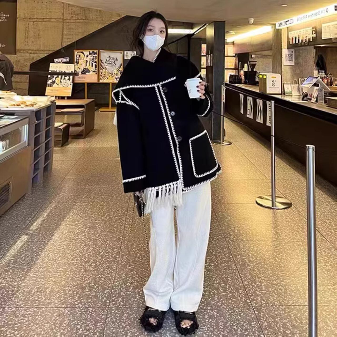 ダブルフェイス ウール(厚手) 手編み 配色 トリミング シングルブレスト