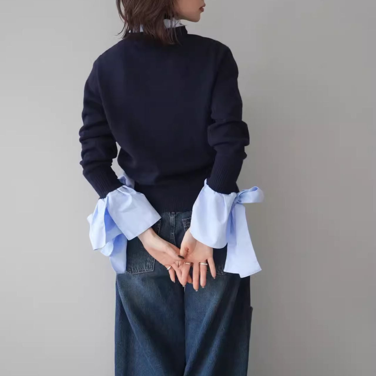 ♡袖フリル&リボン 衿スタンド+クルーカーディ フェイクツーピース