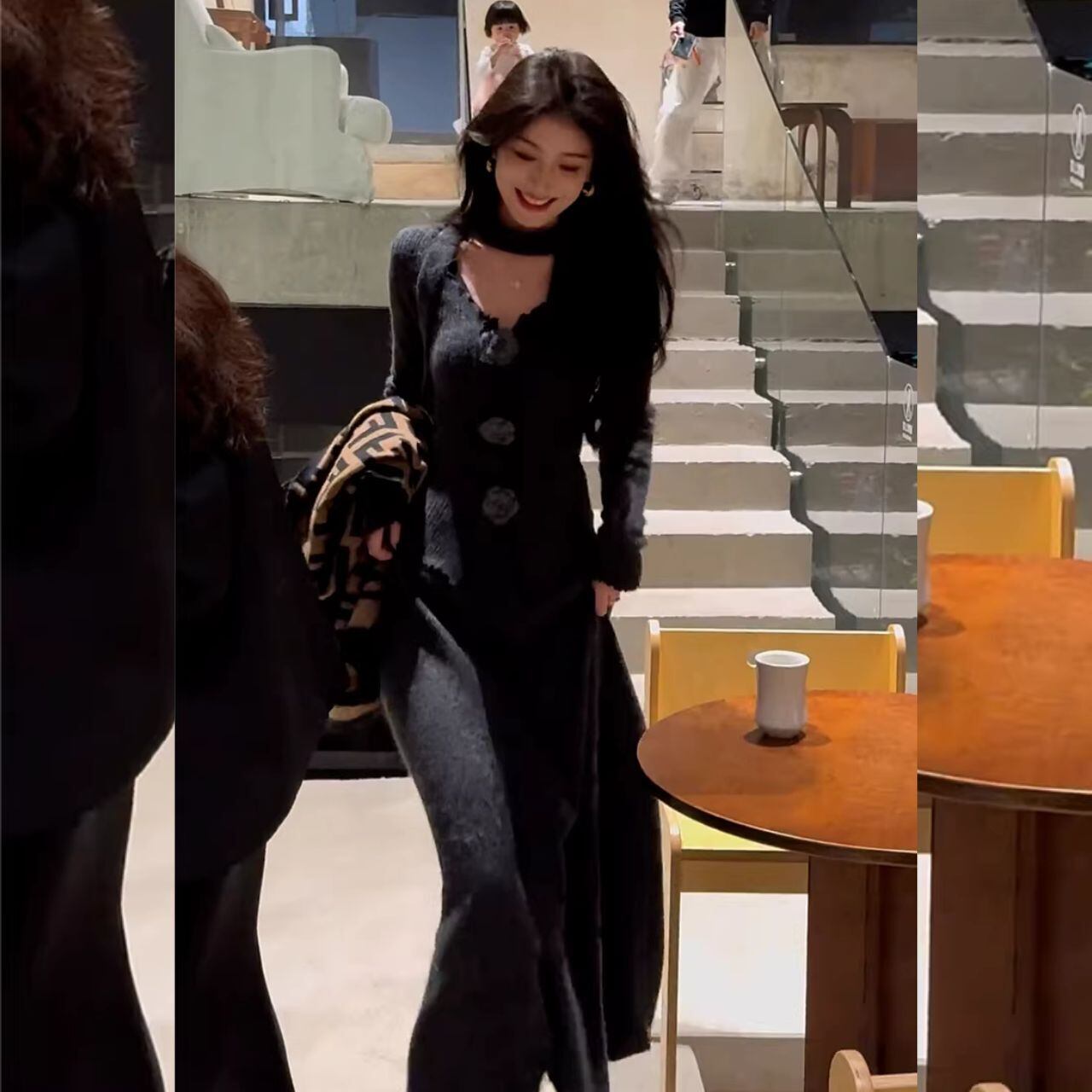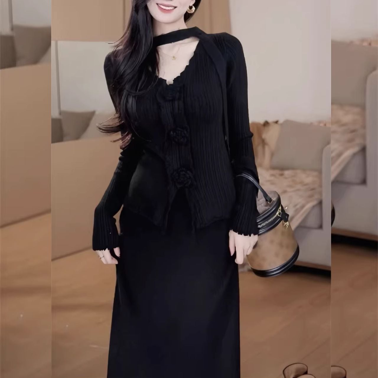 ♡ハイゲージニット Vネック フラワーモチーフ トップス+ロング フレアースカート セット