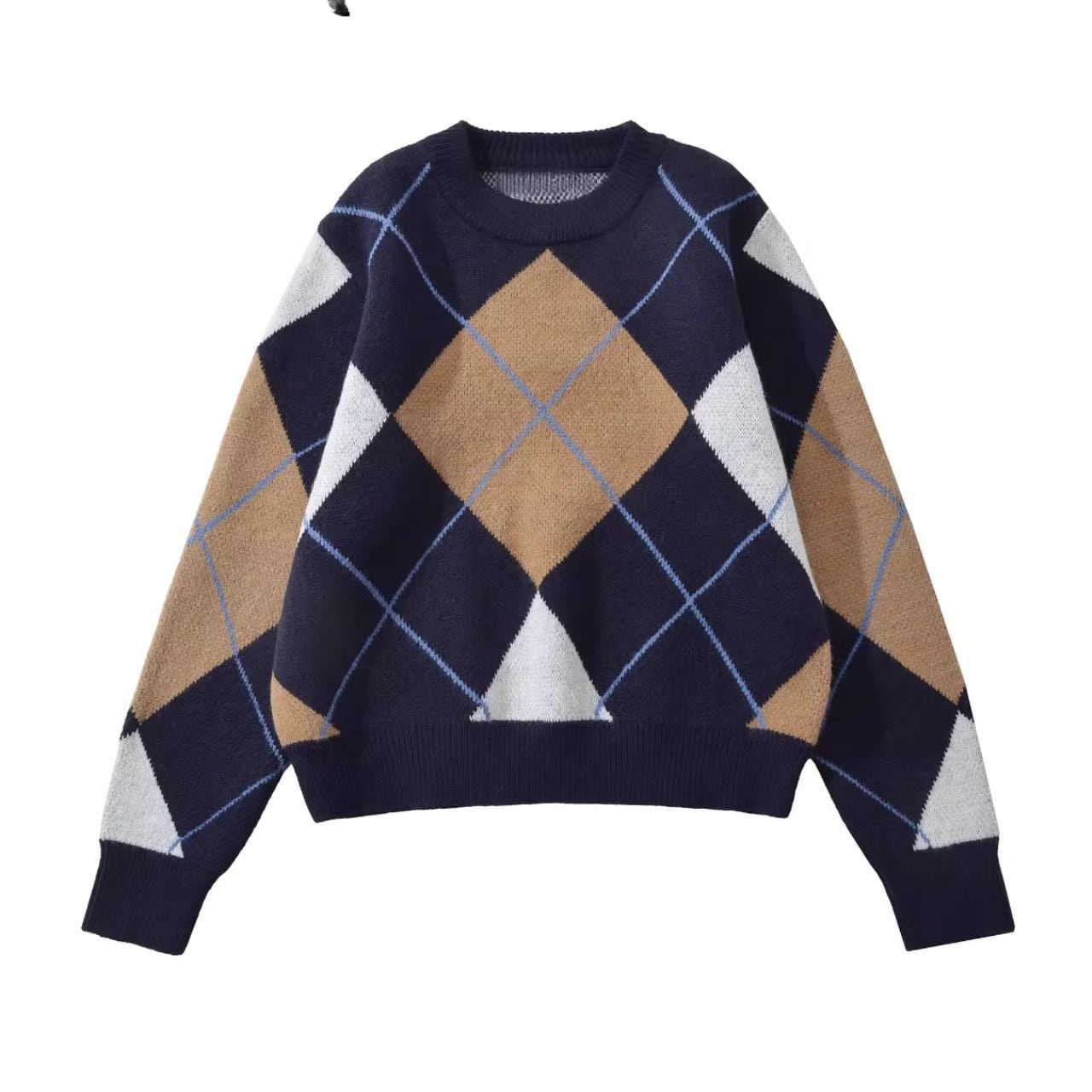 ♡ミドルゲージ Wジャガード アーガイル柄 ラウンドネック プルオーバーニット
