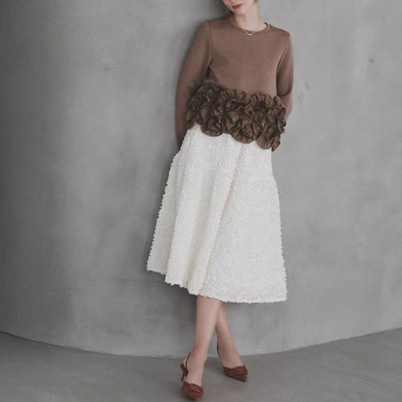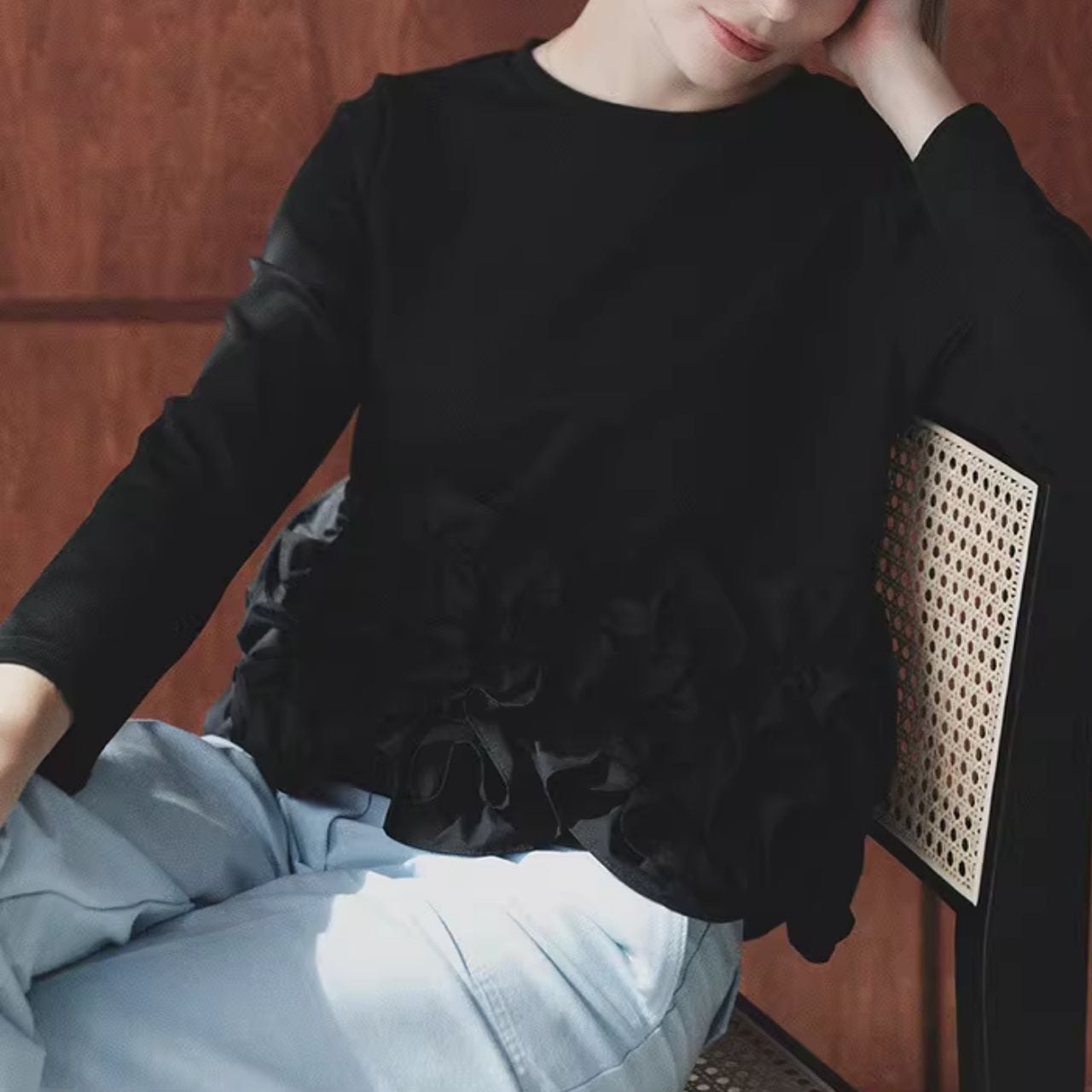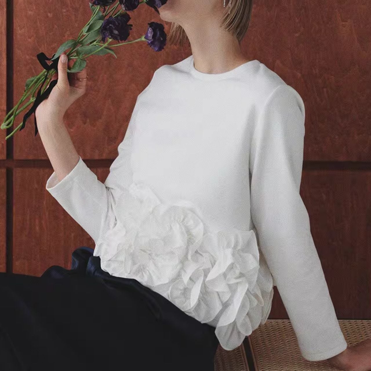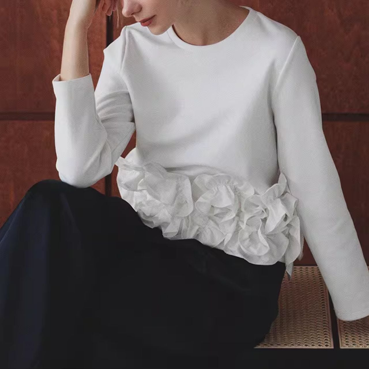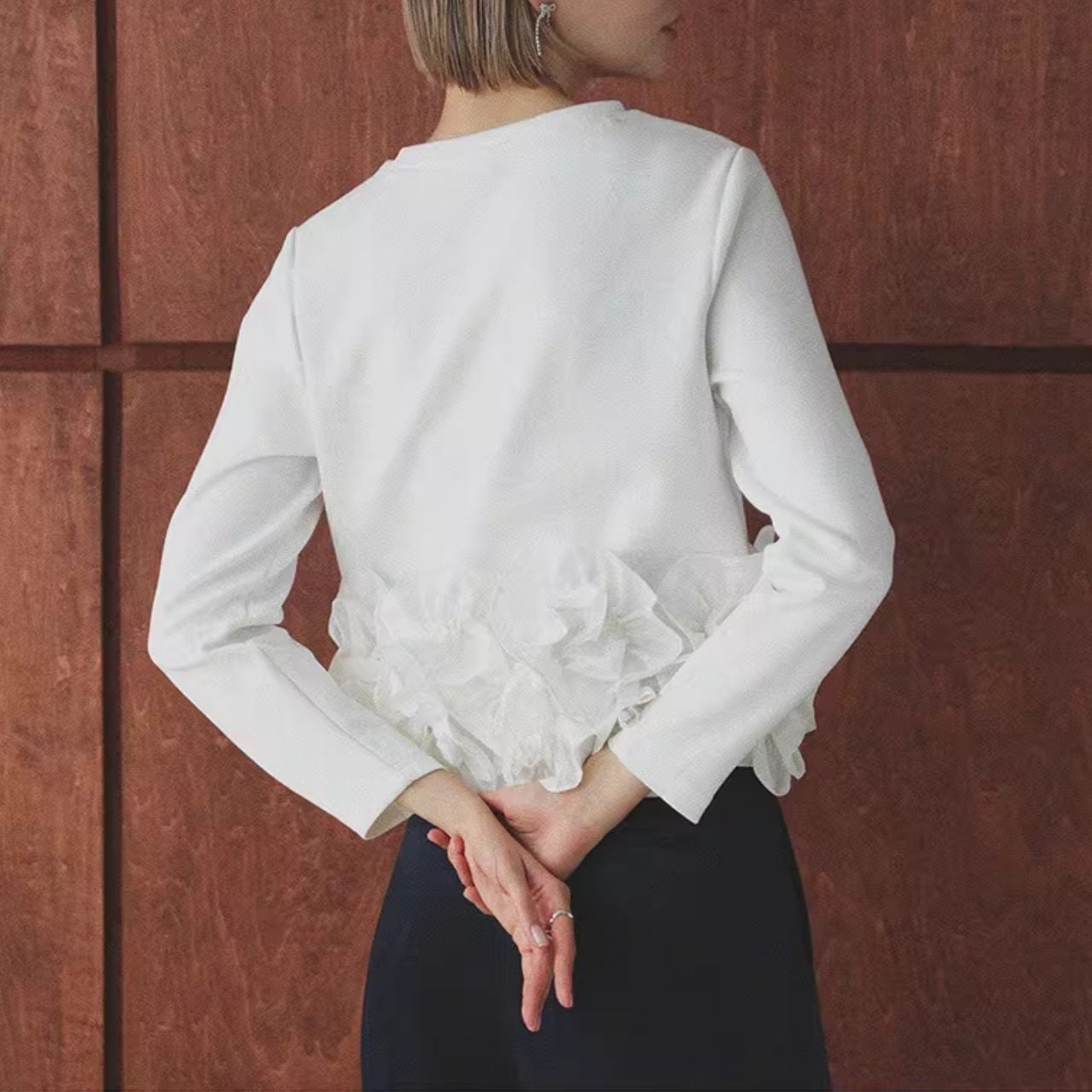 ♡ラウンドネック 裾 立体フリル&フリル 長袖スゥエット トップス
