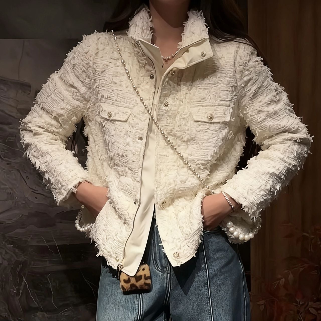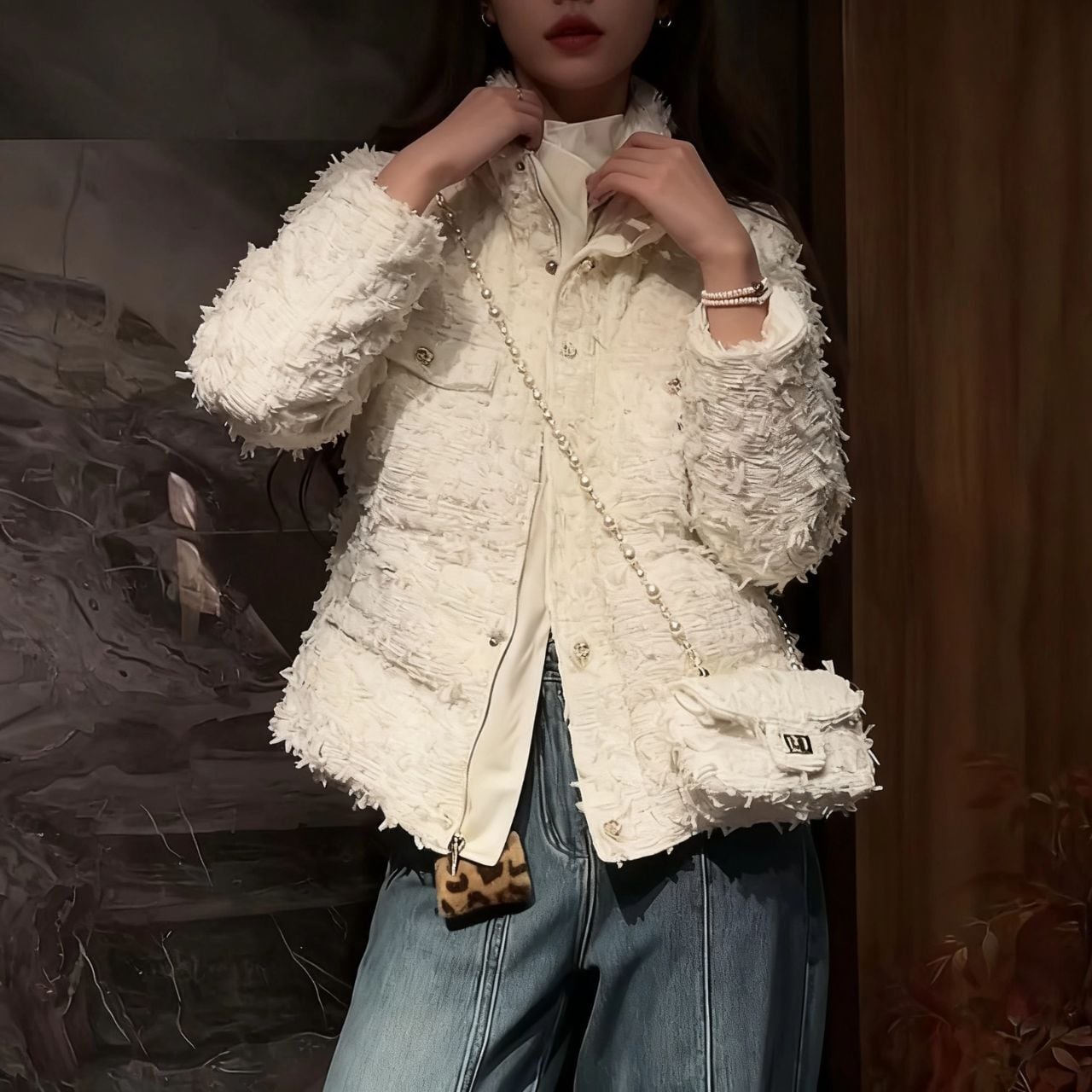 ♡中綿 リボンヤーン ツイード スタンドカラー シップアップ&ドットボタン ジャケット