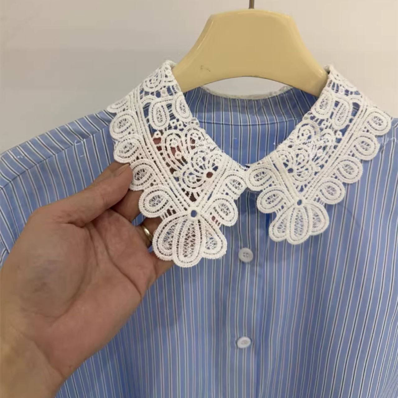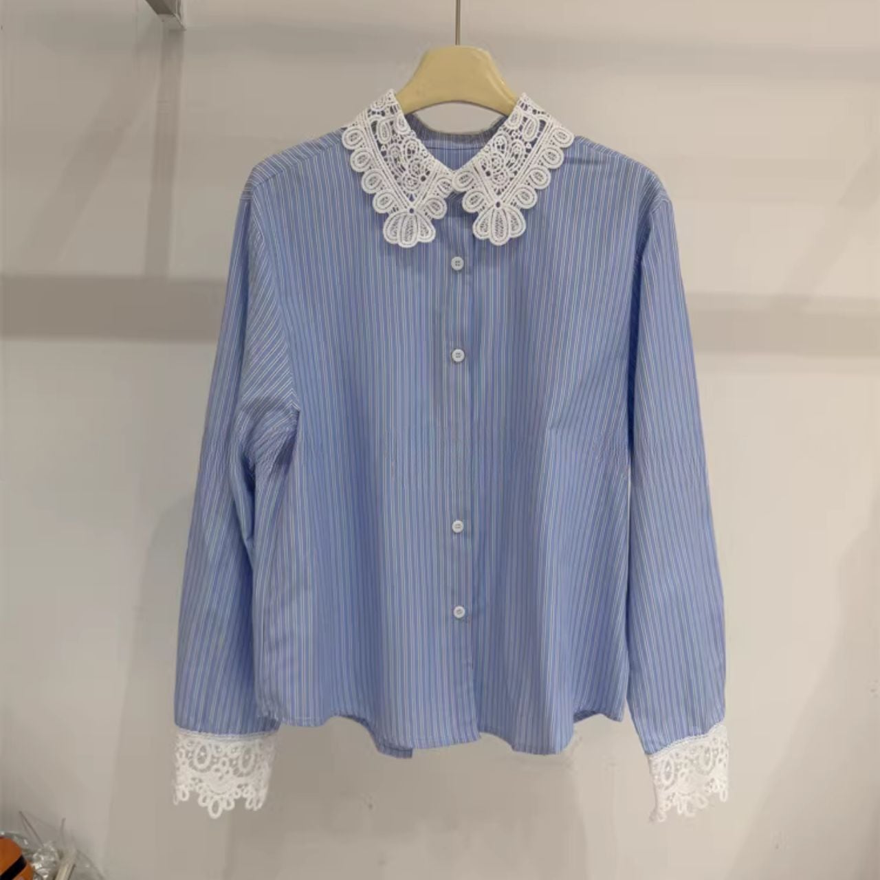 ♡バイカラー 衿と&カフス ケミカルレース ストライプ シャツブラウス