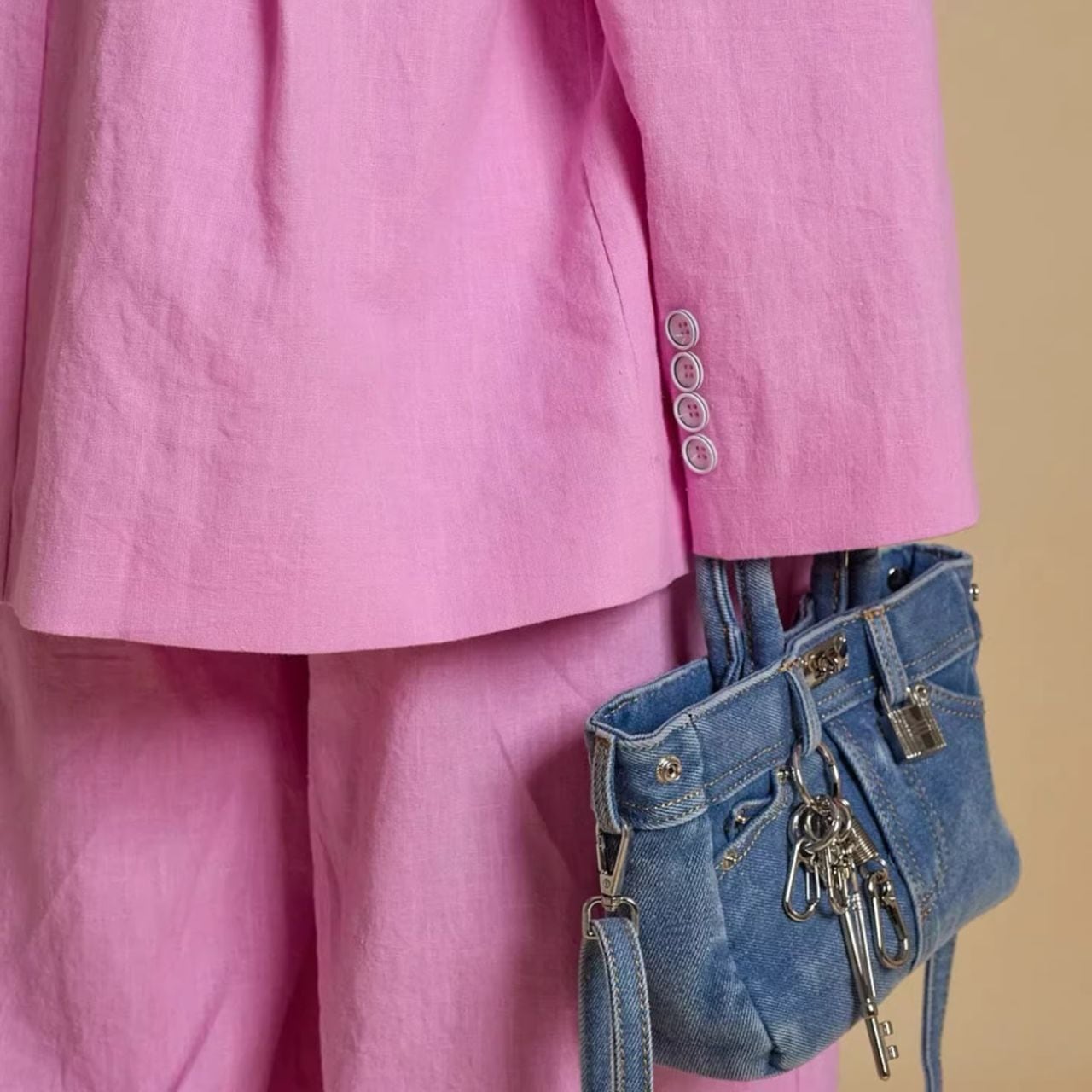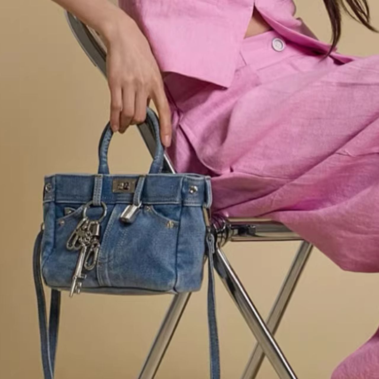♡シルバーバックル 2ハンドル ショルダーストラップ 鍵 キーチャーム付き デニムバッグ