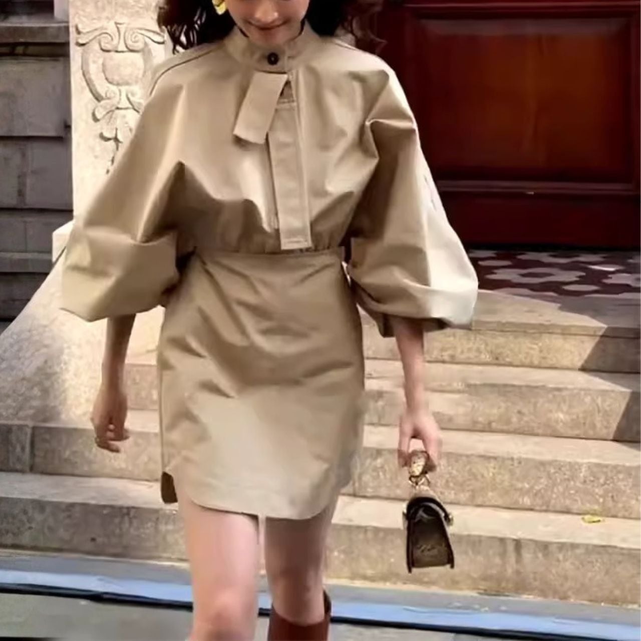 ♡スタンドカラー 飾りタイ ふんわりドルマン 袖口ゴム ブラウジング ミニドレス
