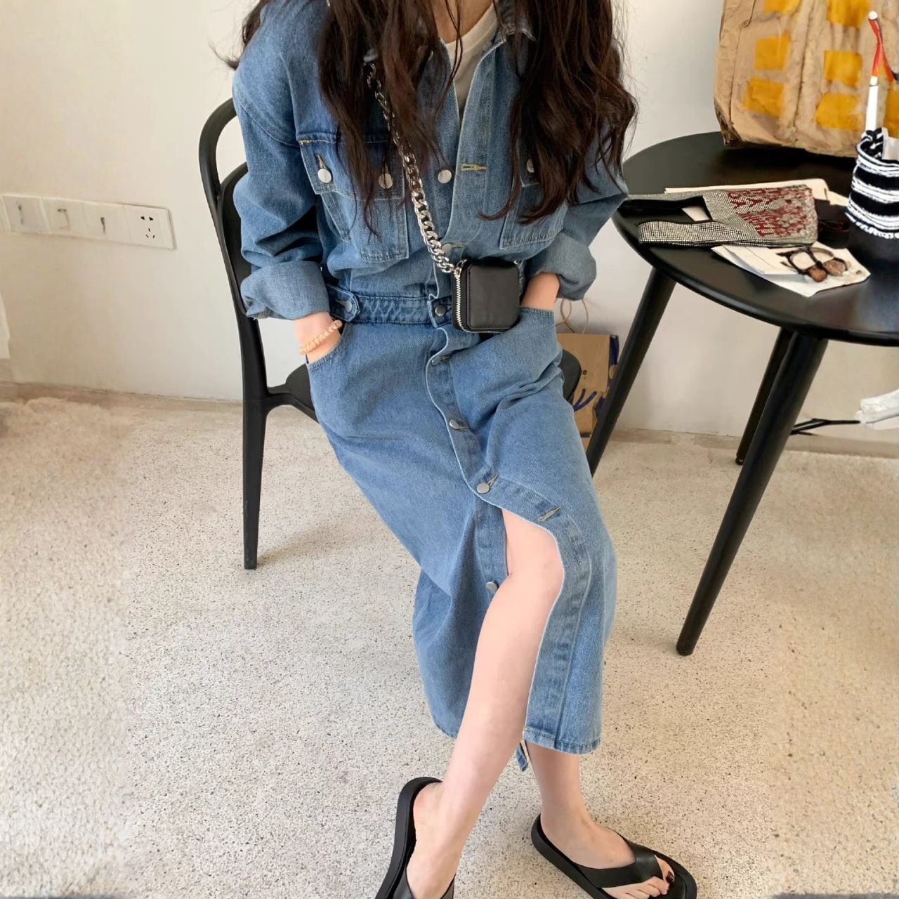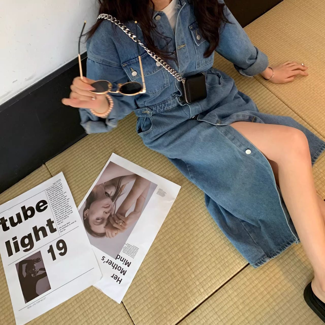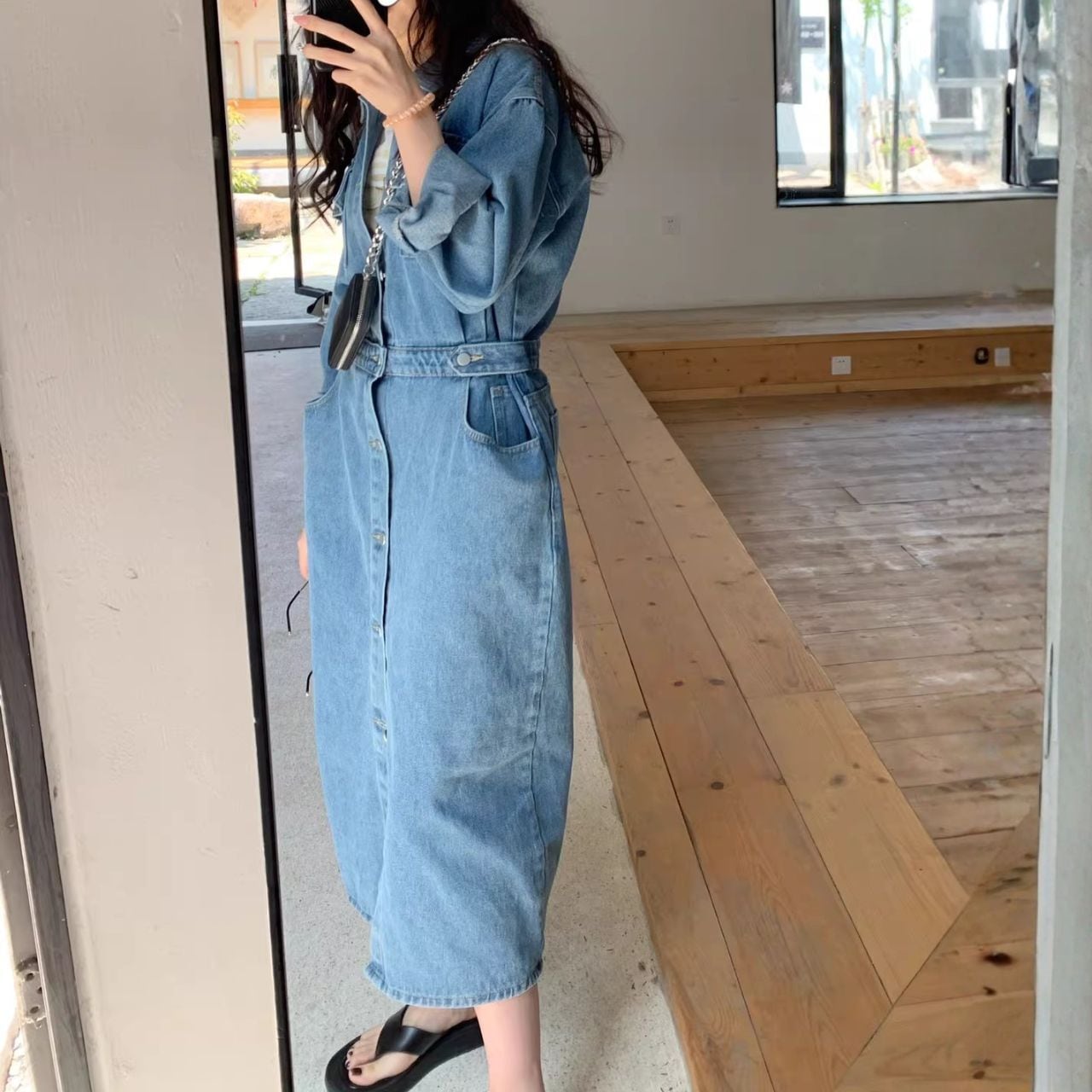 ♡シャツカラー シングルブレスト ゆったりトップス ウエスト切替 デニムドレス