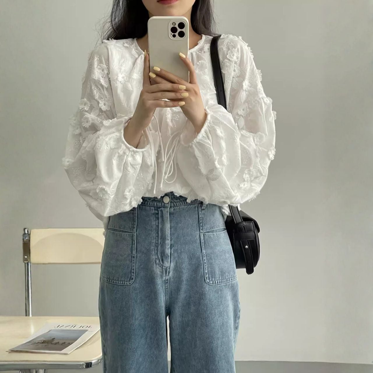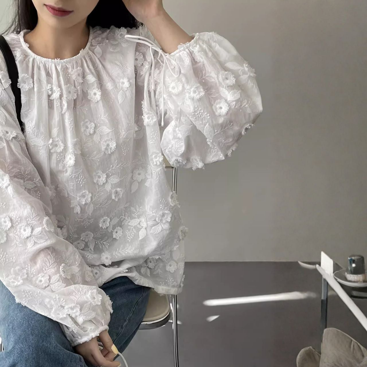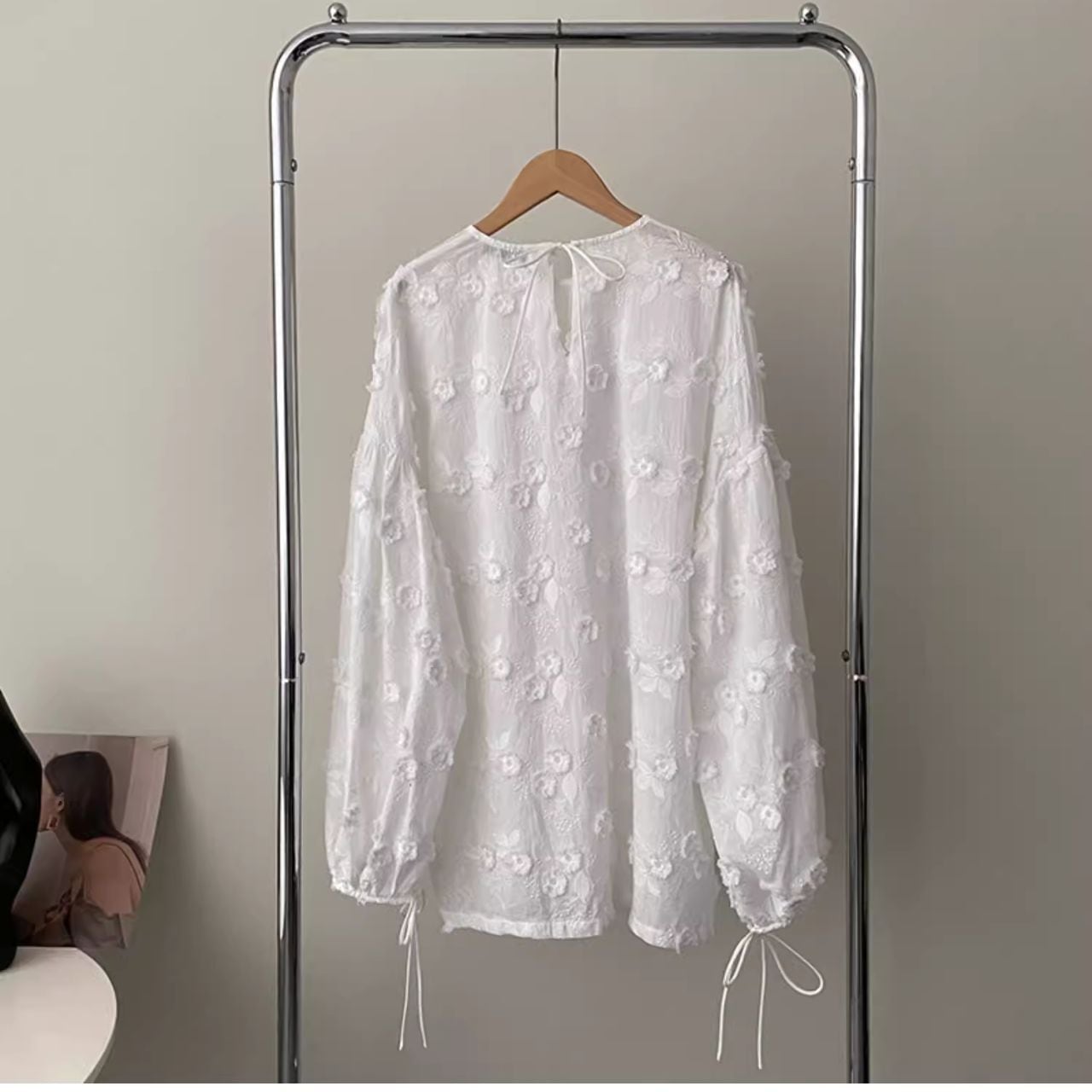 3Dフラワー&刺繍 ラウンドネック 後リボン ふんわりスリーブ 袖口リボン ブラウス