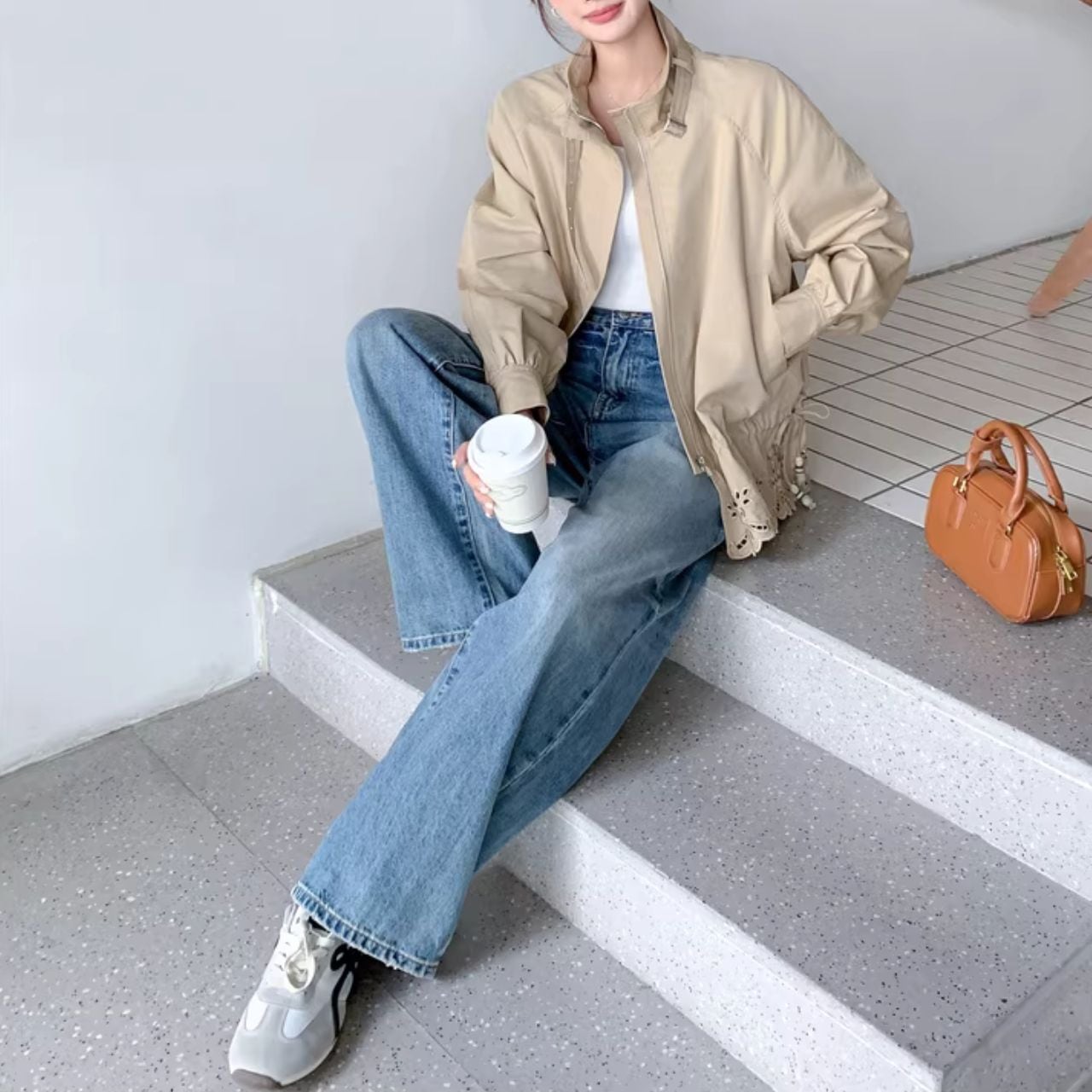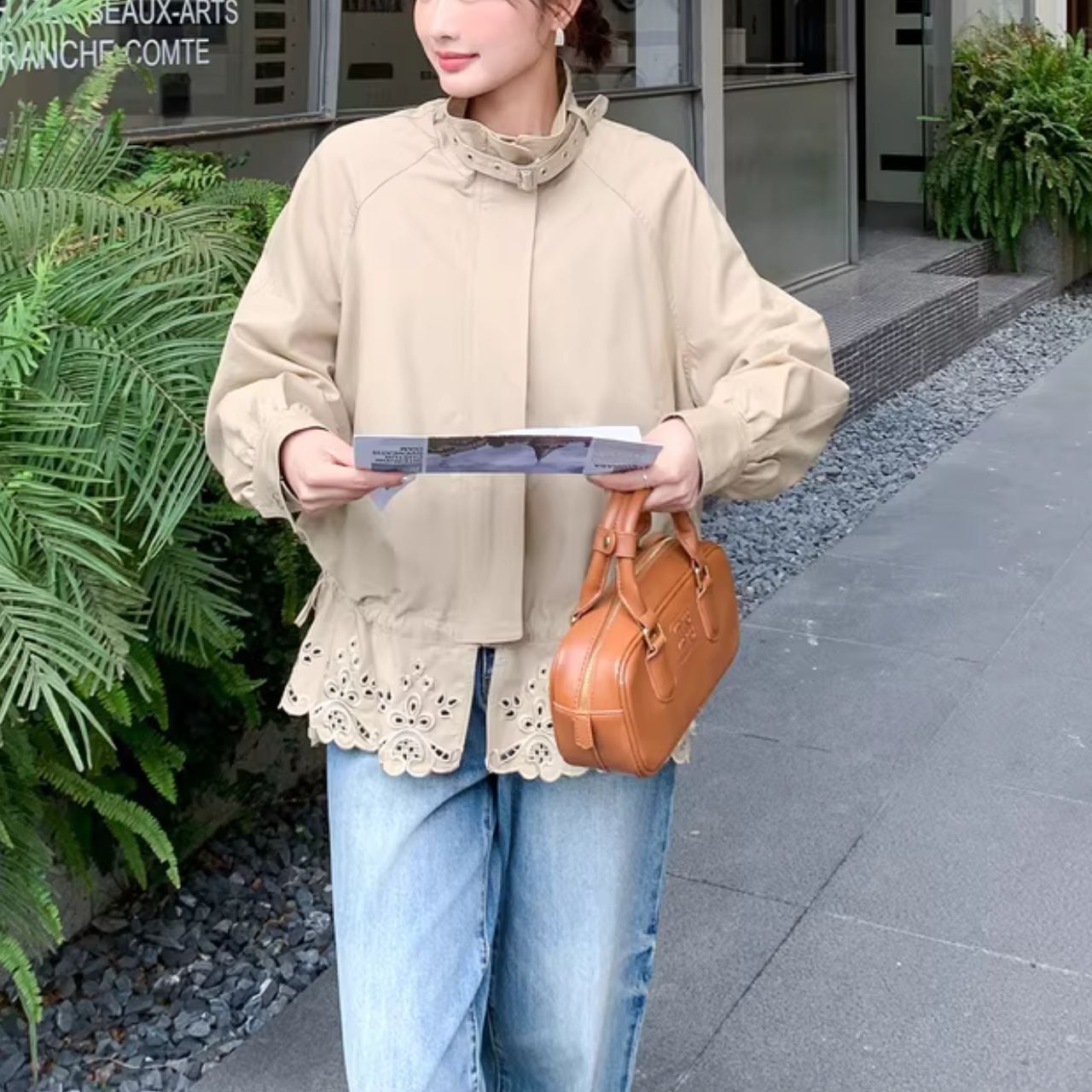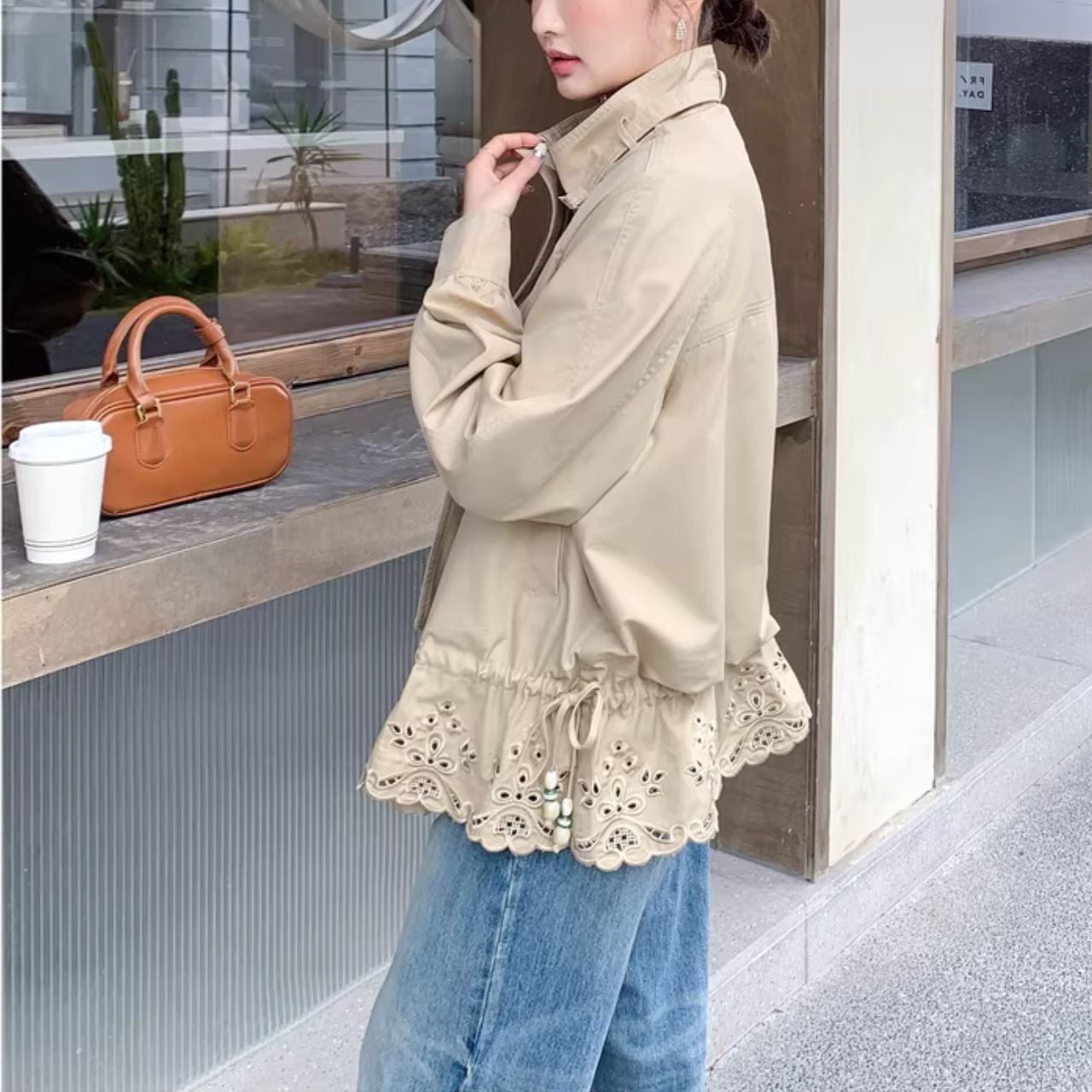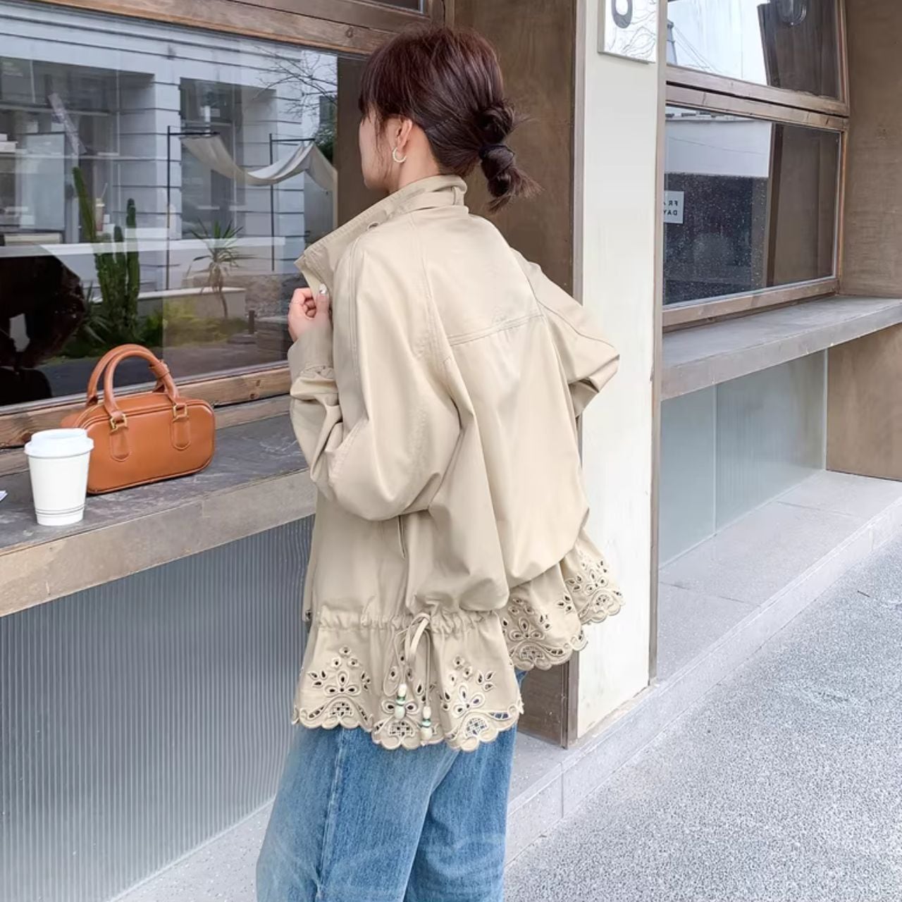 ♡裾切替スカラップ刺繍 ドロスト サイドリボン スタンドカラー ジップアップ ブルゾン