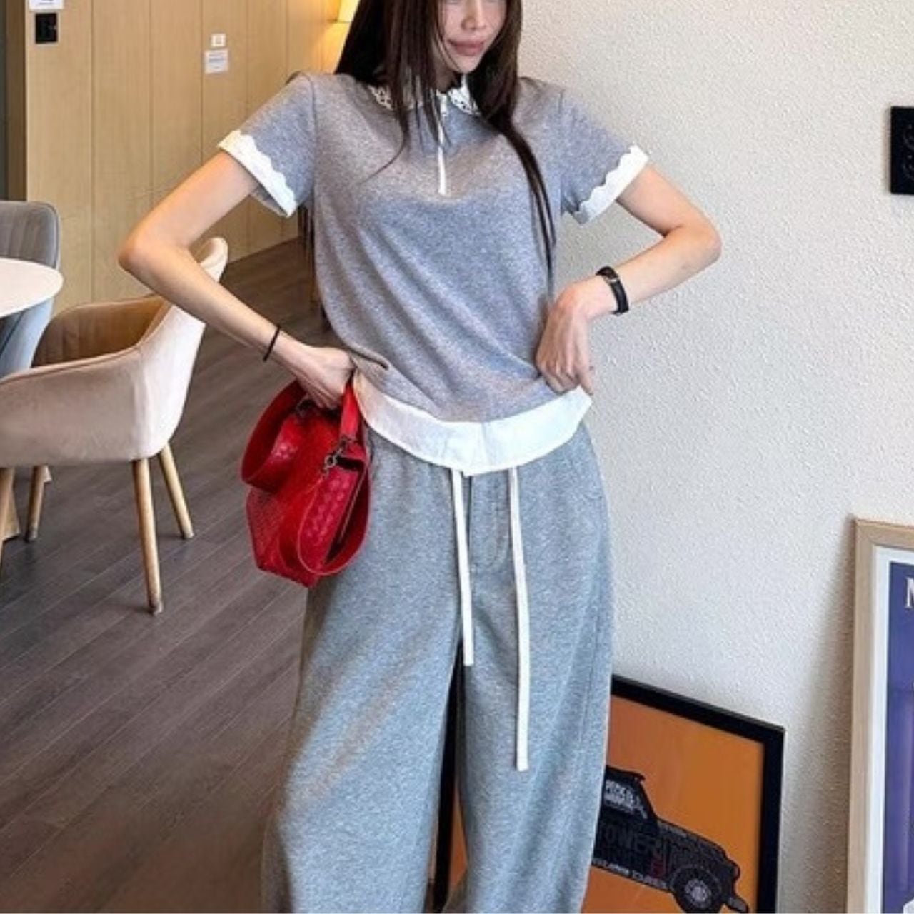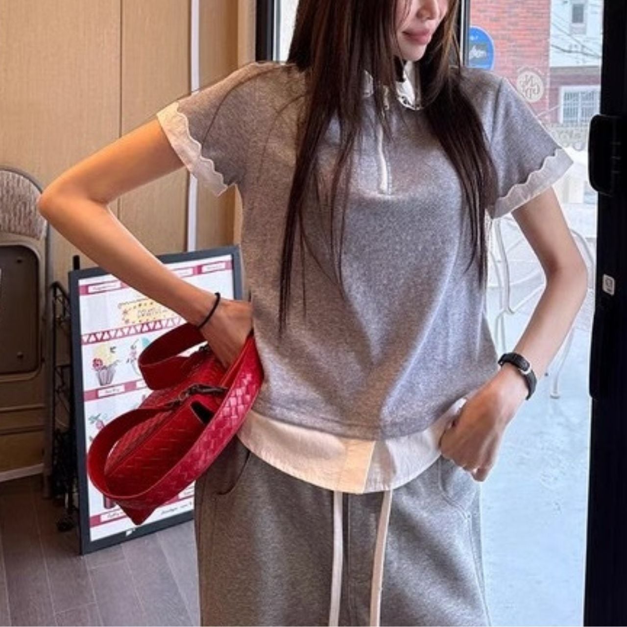♡レース衿シャツ+Tシャツ フェイクツーピース ジップアップ 半袖トップス