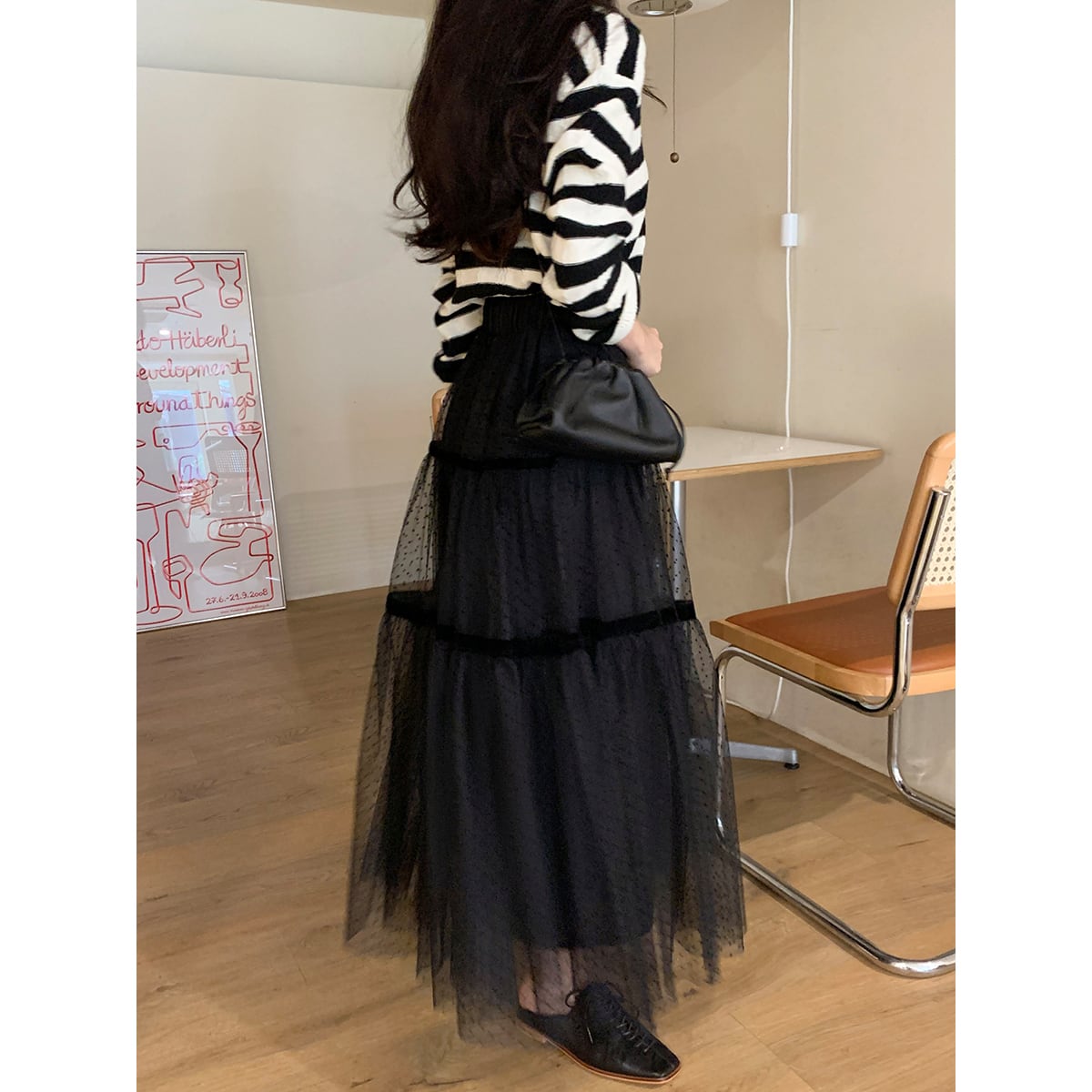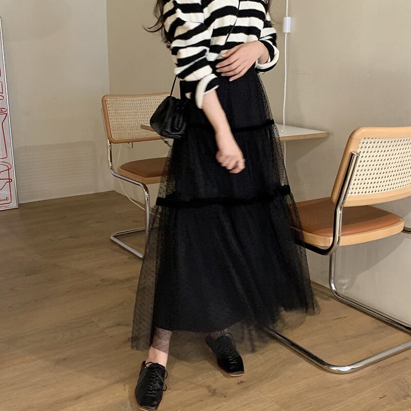 ♡ドット柄 ライン切替 ウエストゴム ロング丈