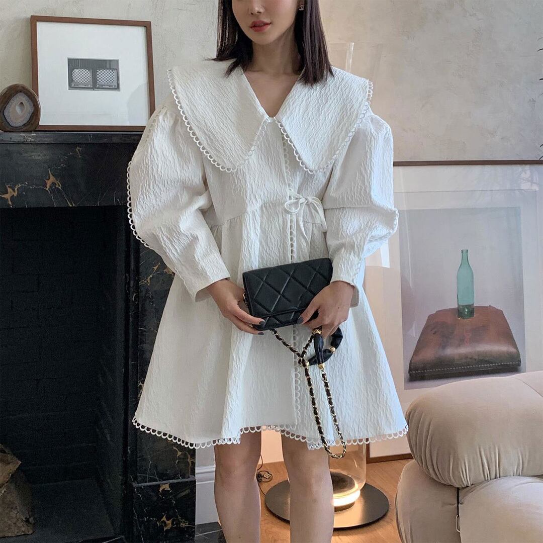 ♡大きな衿 スカラップトリミング パフスリーブ ウエストリボン