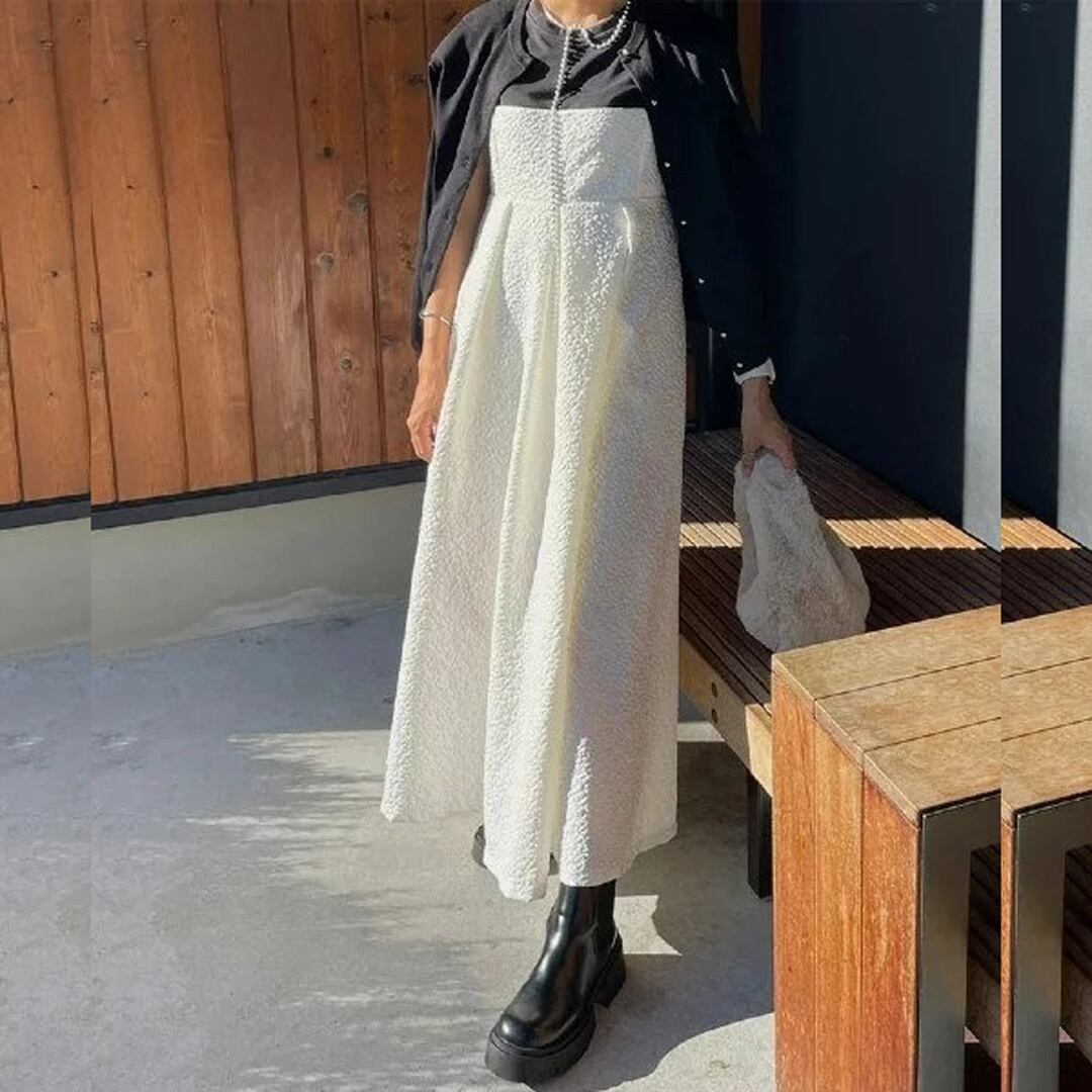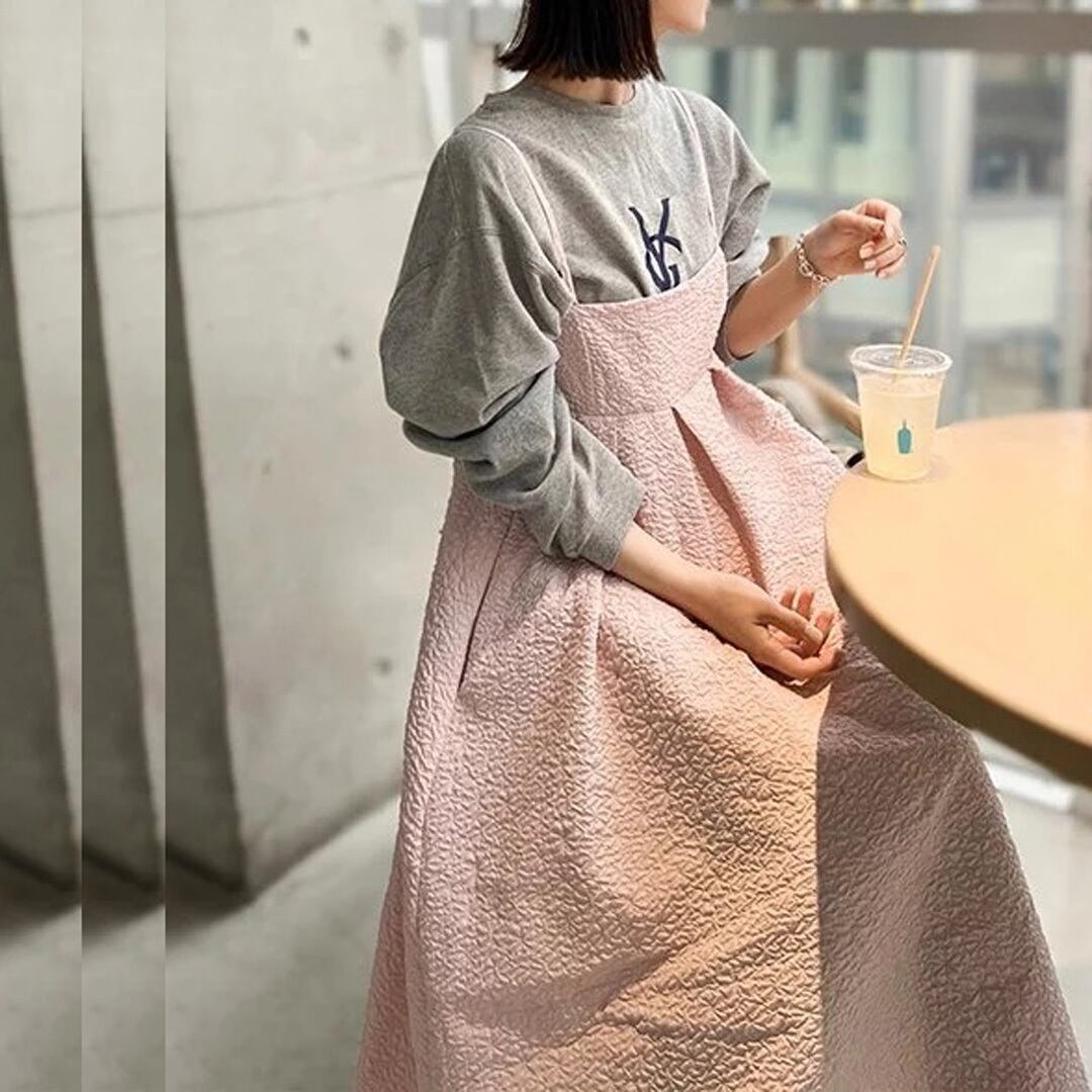 ♡凹凸膨れジャガード 肩ひも調節可能 ハイウエ切替 タックフレアー