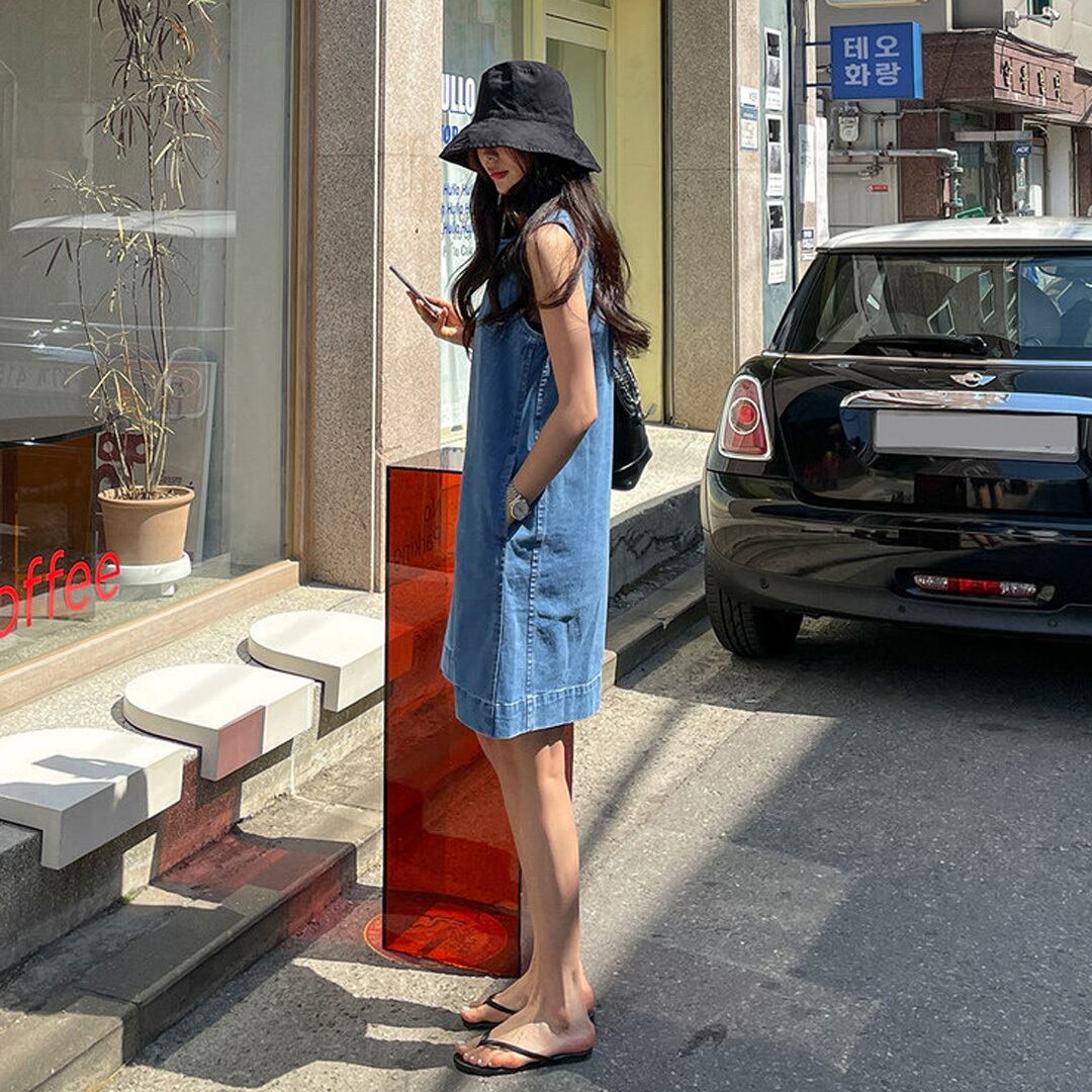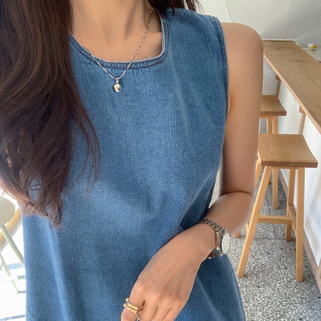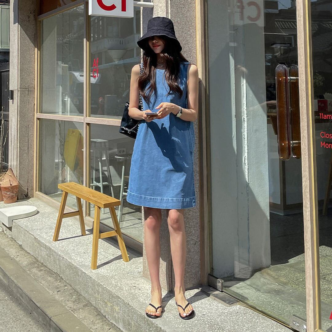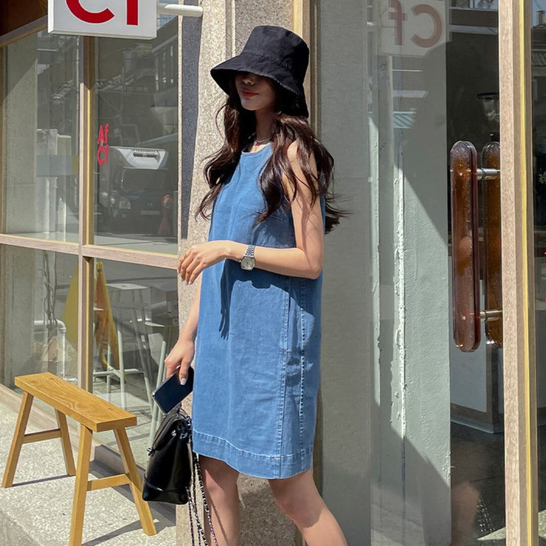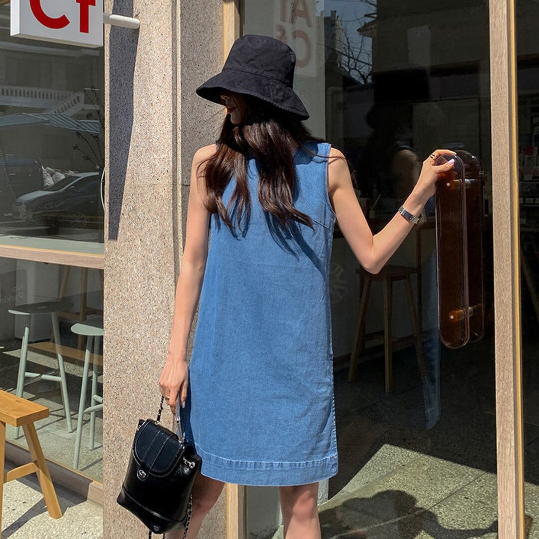 ♡ウォッシュドデニム ラウンドネック 後1つ釦あき サイド切替 ポケット 膝丈