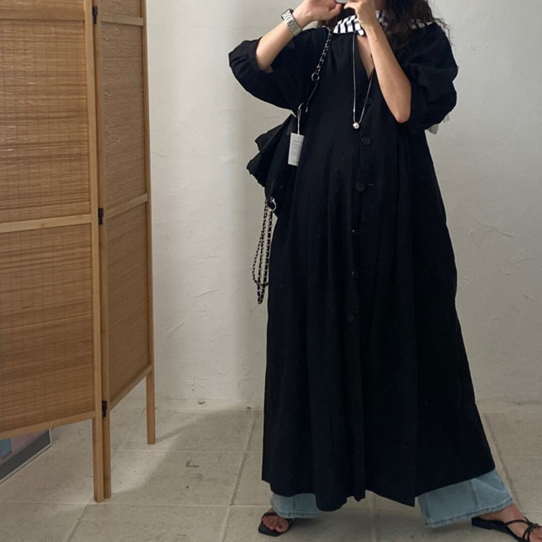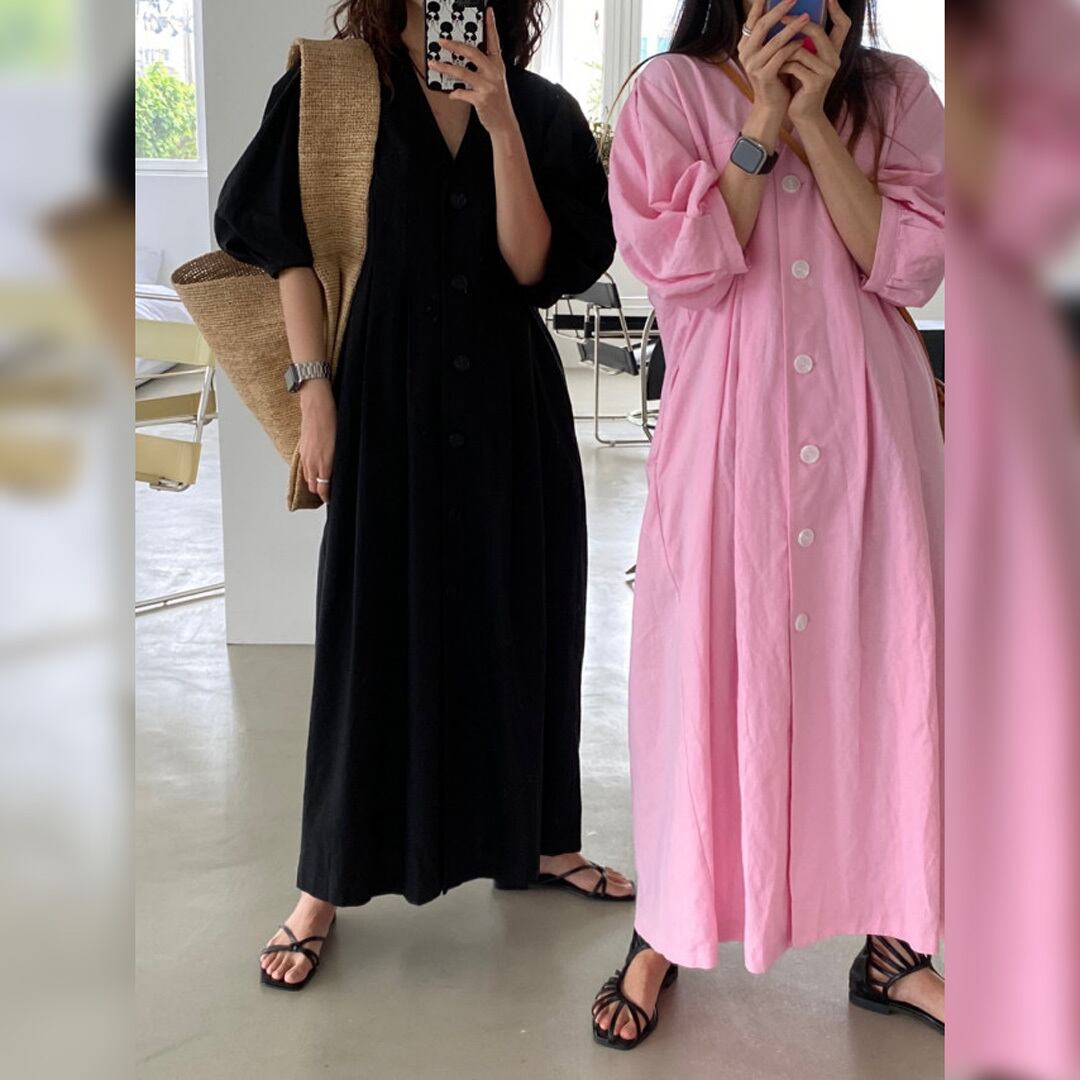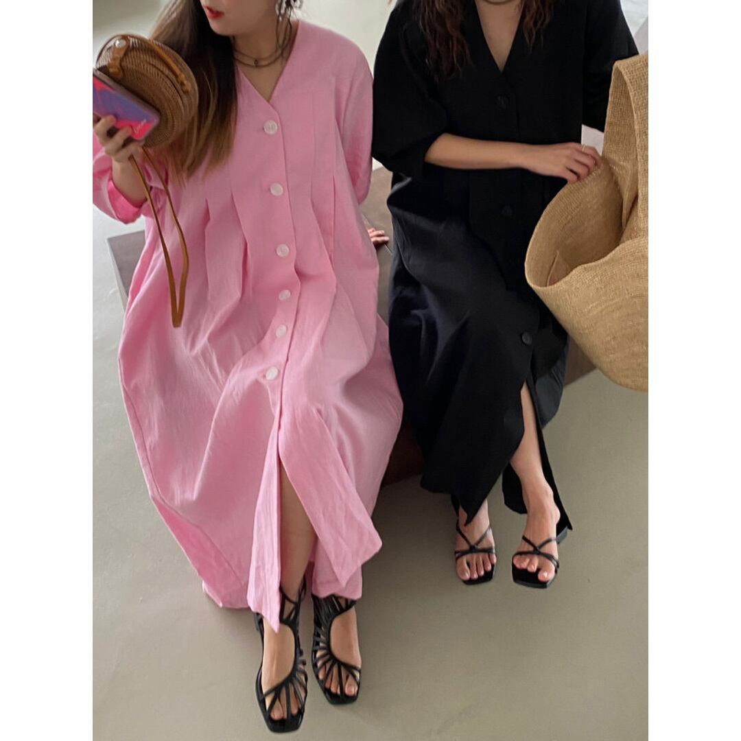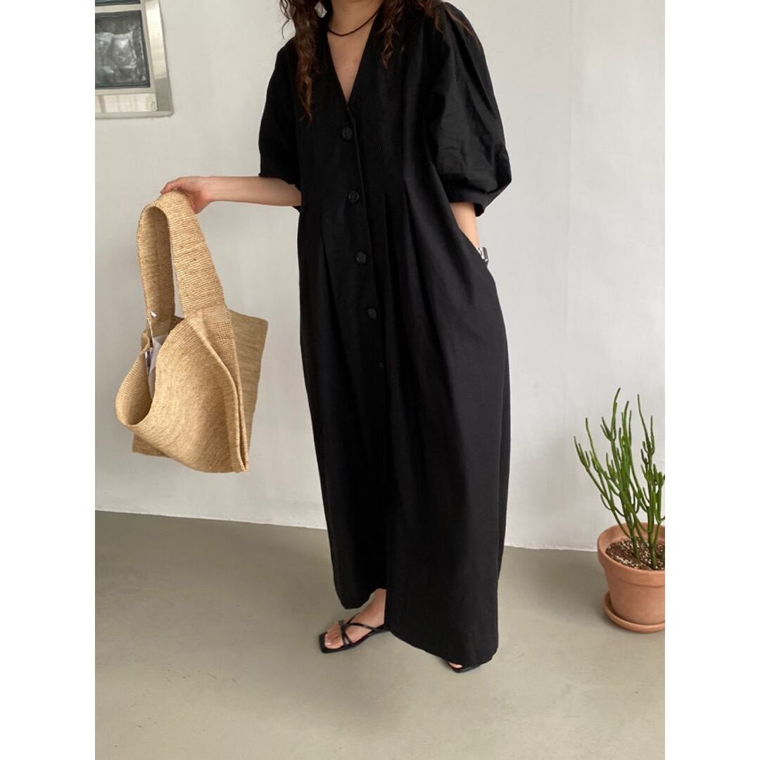 ♡Vネック フロントボタン タックストレート パフ5分袖