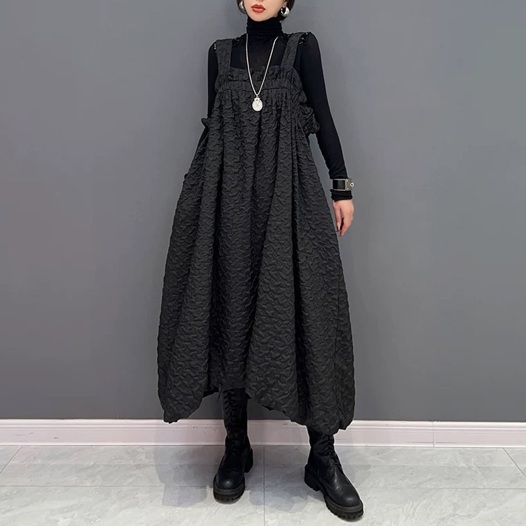 ♡膨れジャガード ゴムフリル 肩ひも調節可能 バルーン ロング丈