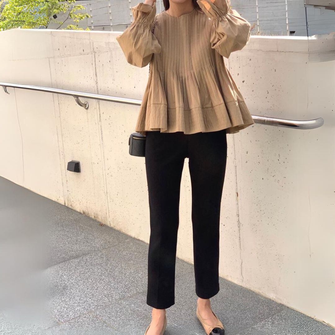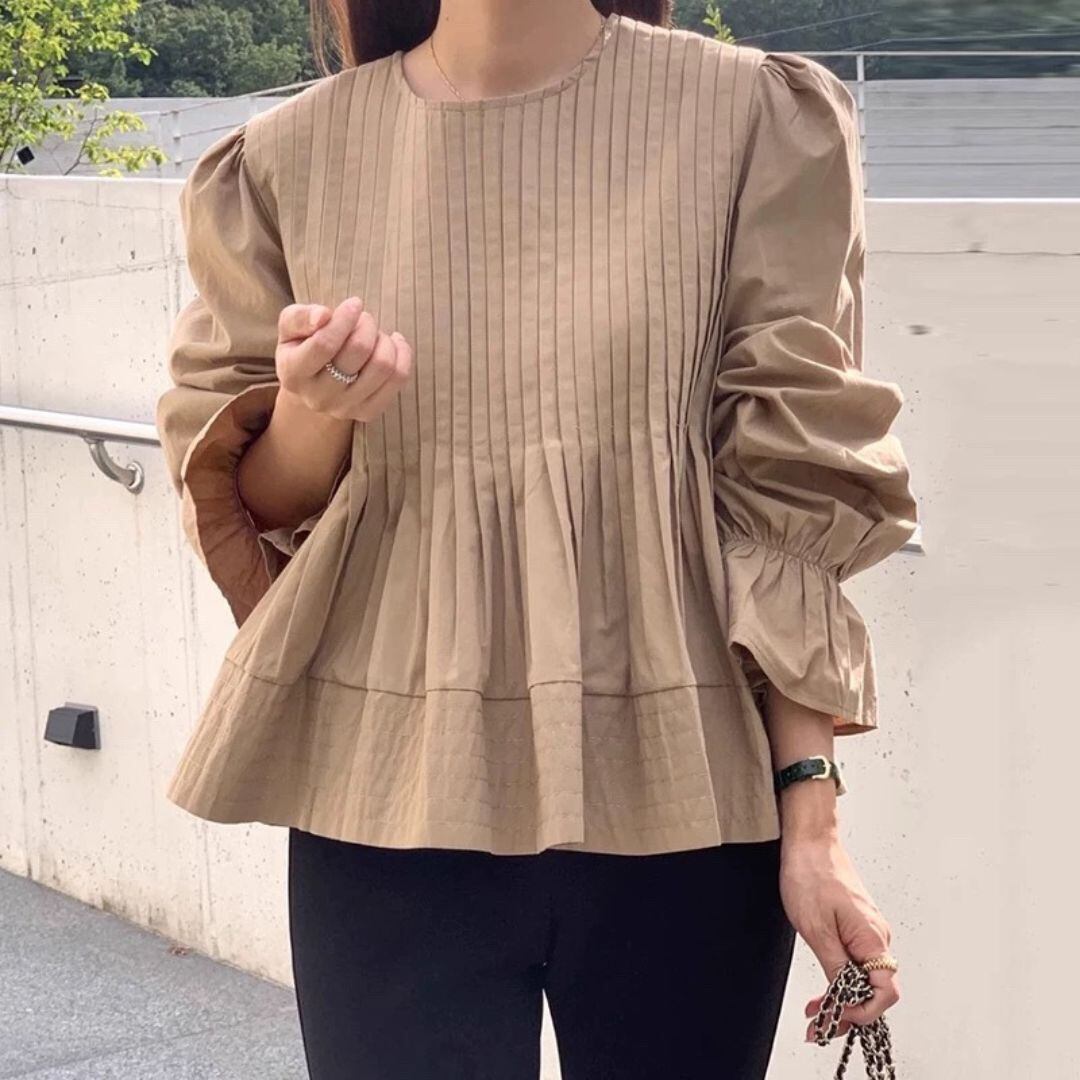 ♡ラウンドネック ピンタック 裾フレアー パフ スリーブ 袖口フレアー