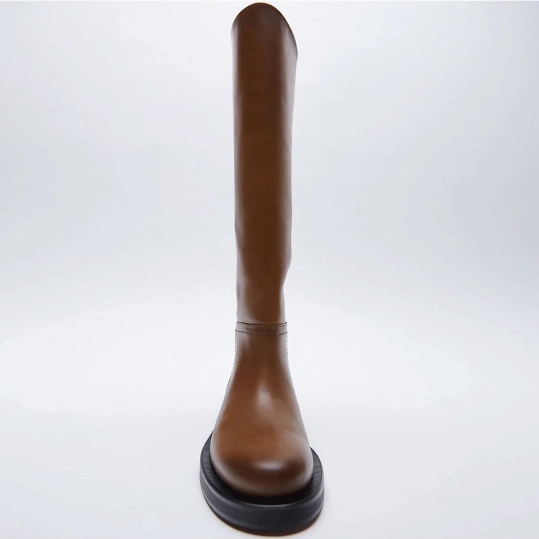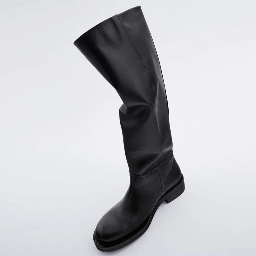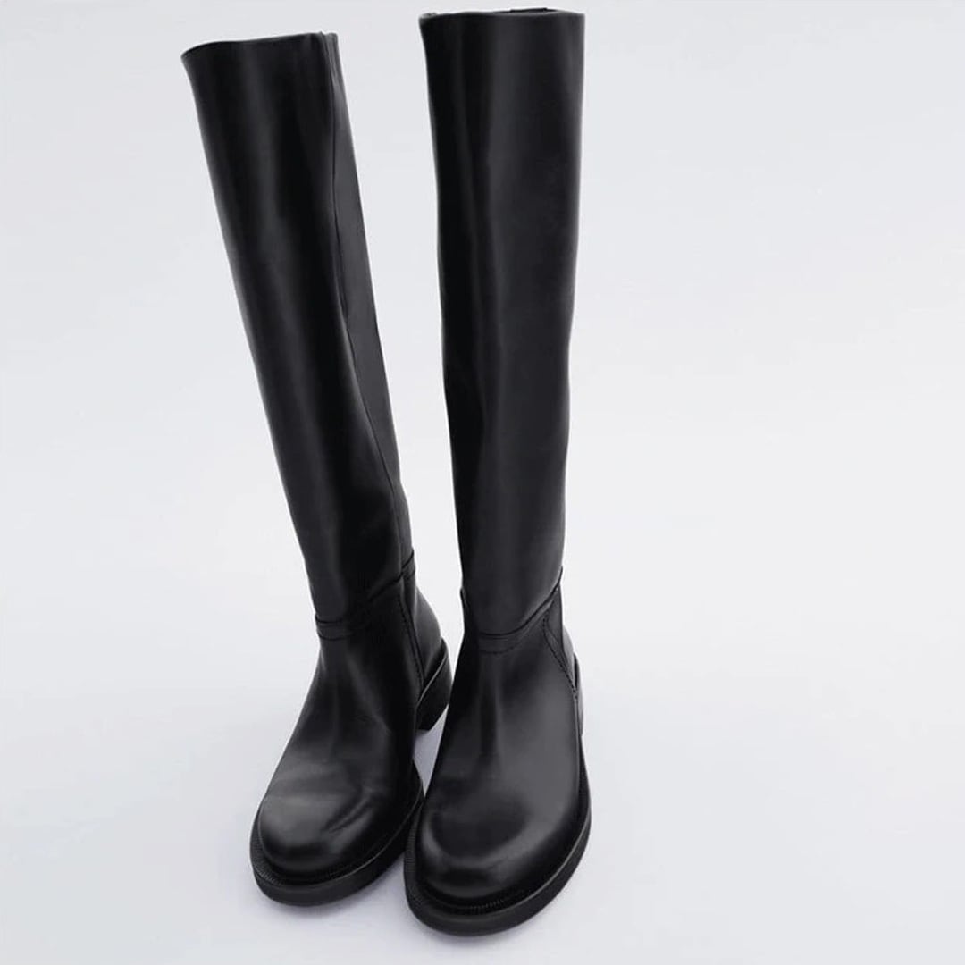 ♡防水 コーティング 牛革 ラウンドトゥ 太ヒール ロング ブーツ