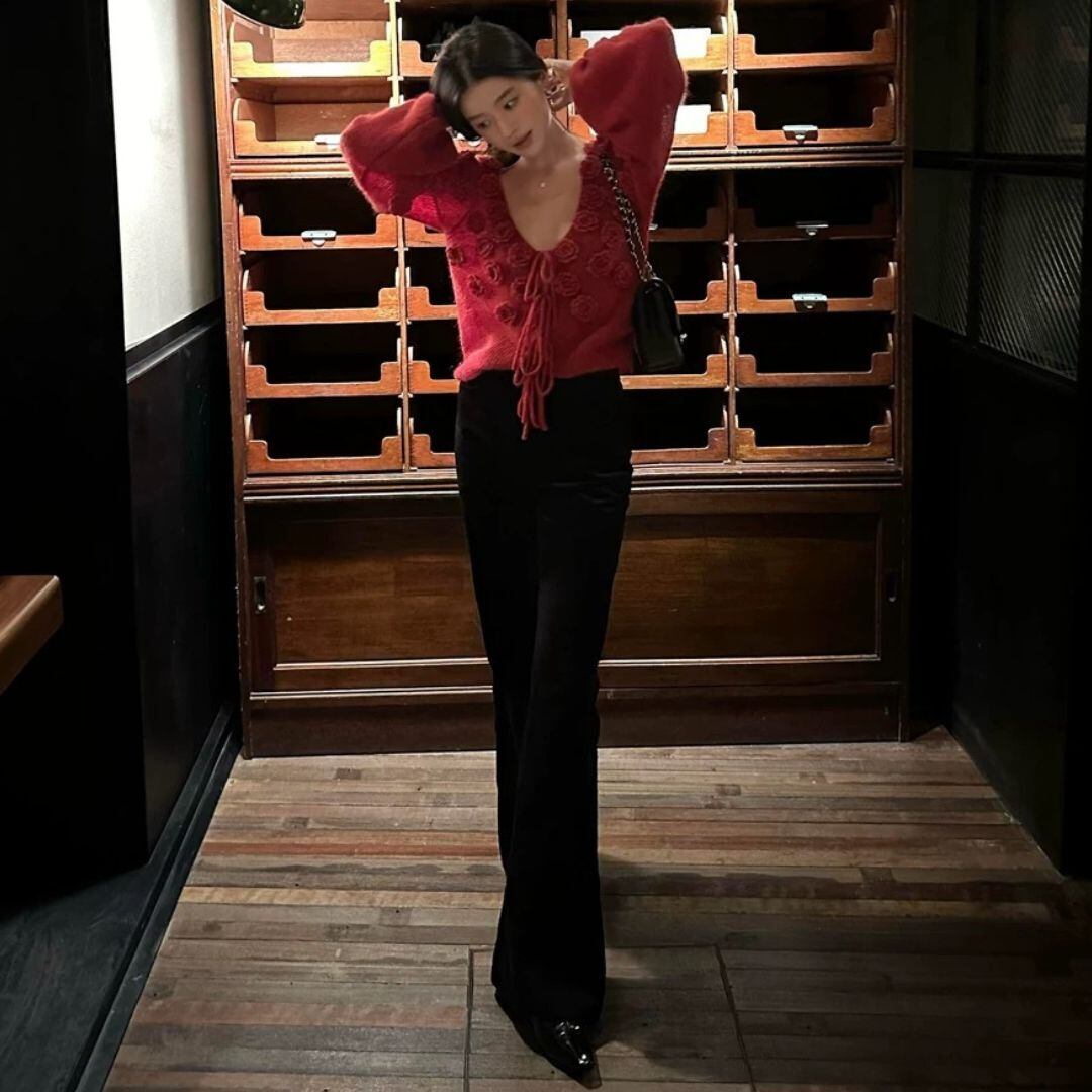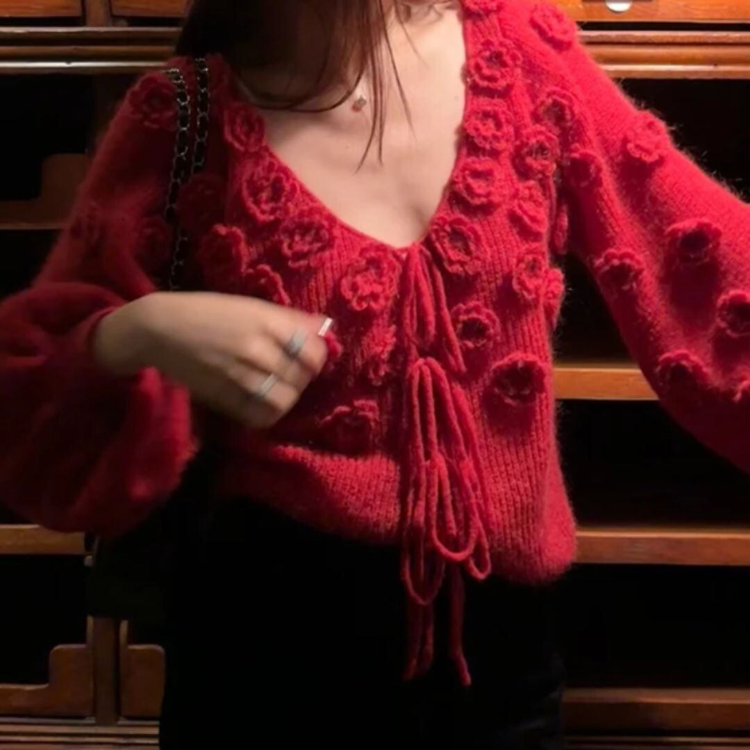 ♡Vネック フラワーモチーフ パフスリーブ リボン結び カーディガン