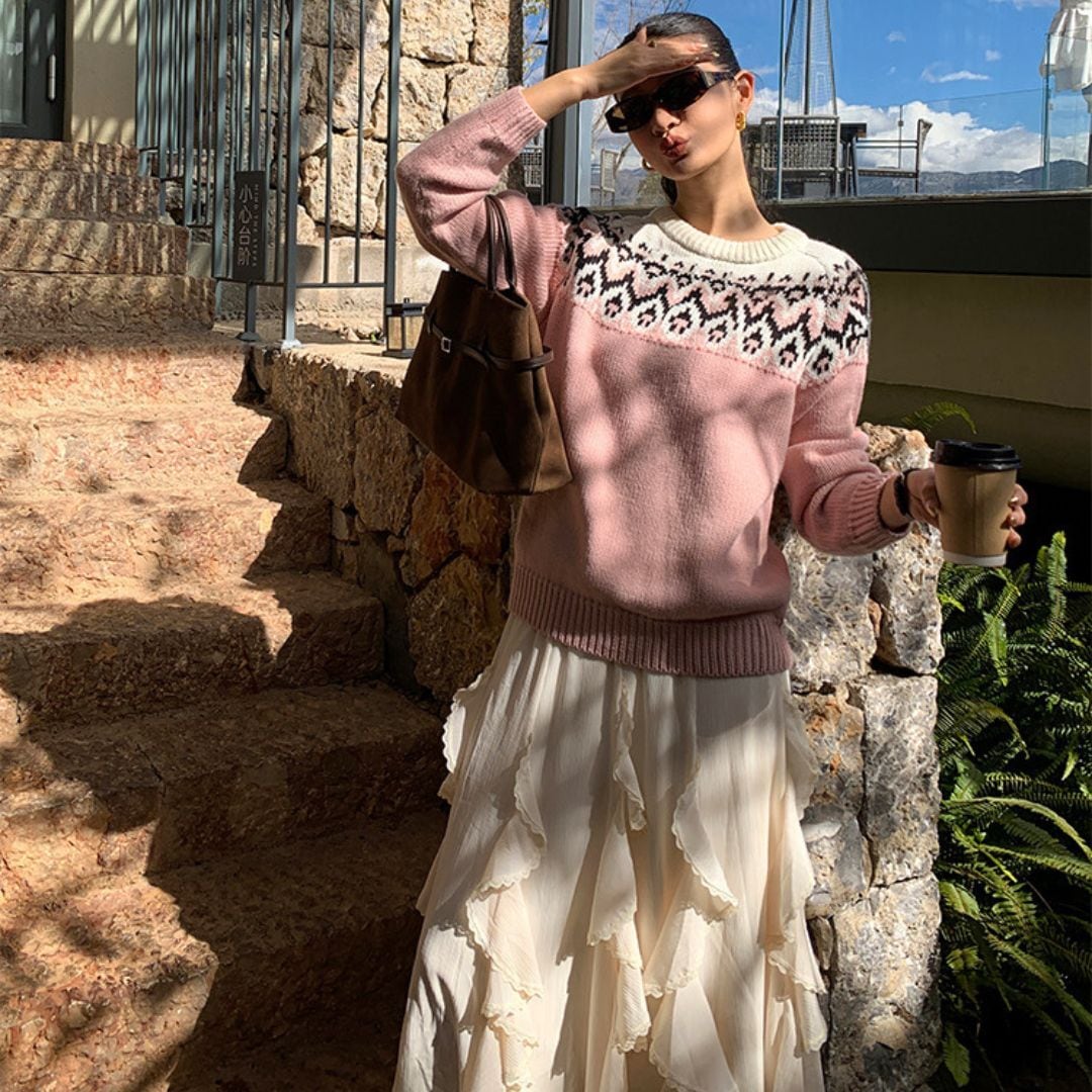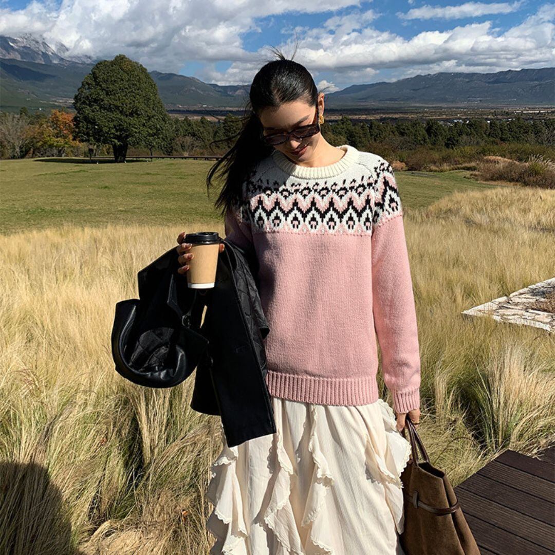 ♡ラウンドネック ミドルゲージ フェアアイルジャカード ラグラン プルオーバー
