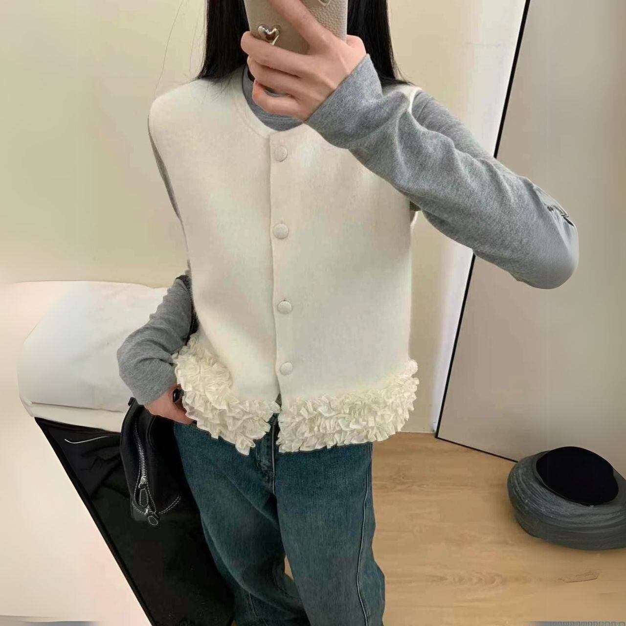 ♡ラクーン混 ハイゲージ ニット ラウンドネック 前ボタン 裾トリプルフリル ベスト